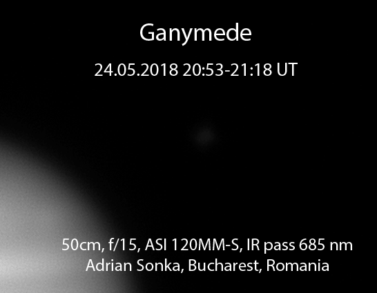 În animația de mai jos vedeți cum satelitul apare. În primele imagini Ganymede se vede pe jumătate pentru că o parte din discul său acoperit de umbra lui Jupiter.