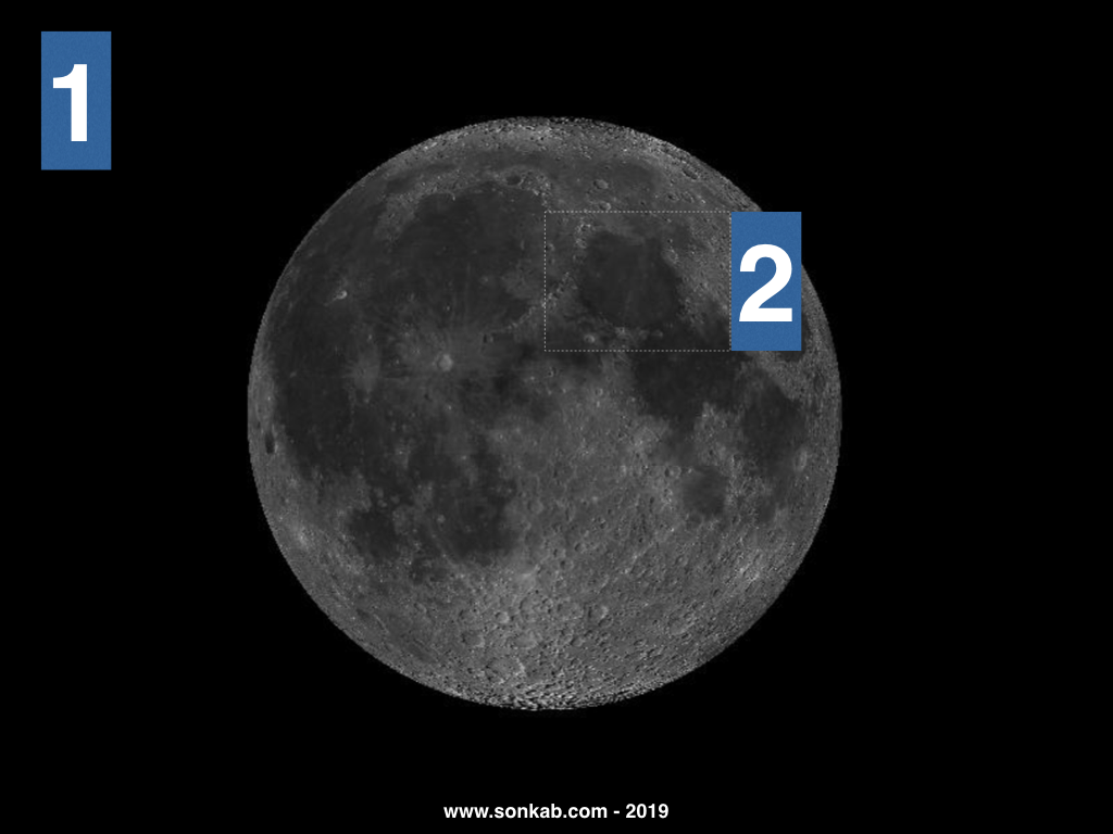 1. În prima imagine se vede… Luna. Toată. Se văd craterele, mările (petele mai întunecate), într-o imagine panoramică realizată din imagini luate de sonda spațială Lunar Reconnaissance Orbiter. Foarte frumos. Dar se mai vede ceva pe Lună: un dreptunghi care are numărul „2” lângă. Aceea este zona pe care o vei vedea în imaginea următoare.