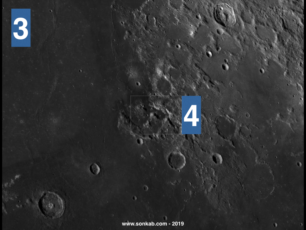 Marea asta este cu puțin mai „mare” decât țara noastră măsurată de la nord la sud și este mărginită de munți și cratere. Munții cuprinși în pătratul 3 sunt cei pe care îi vei vedea măriți în imaginea următoare.
