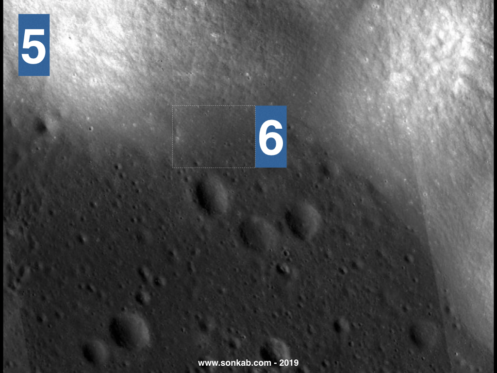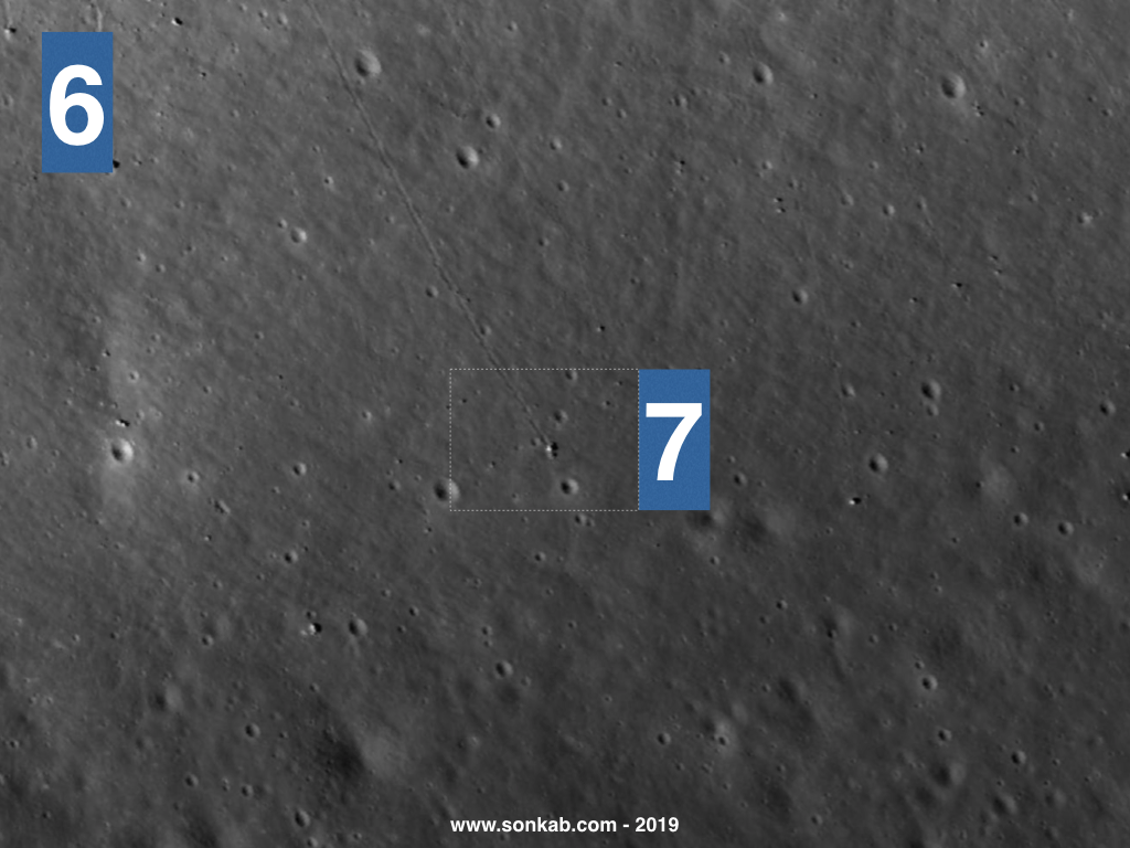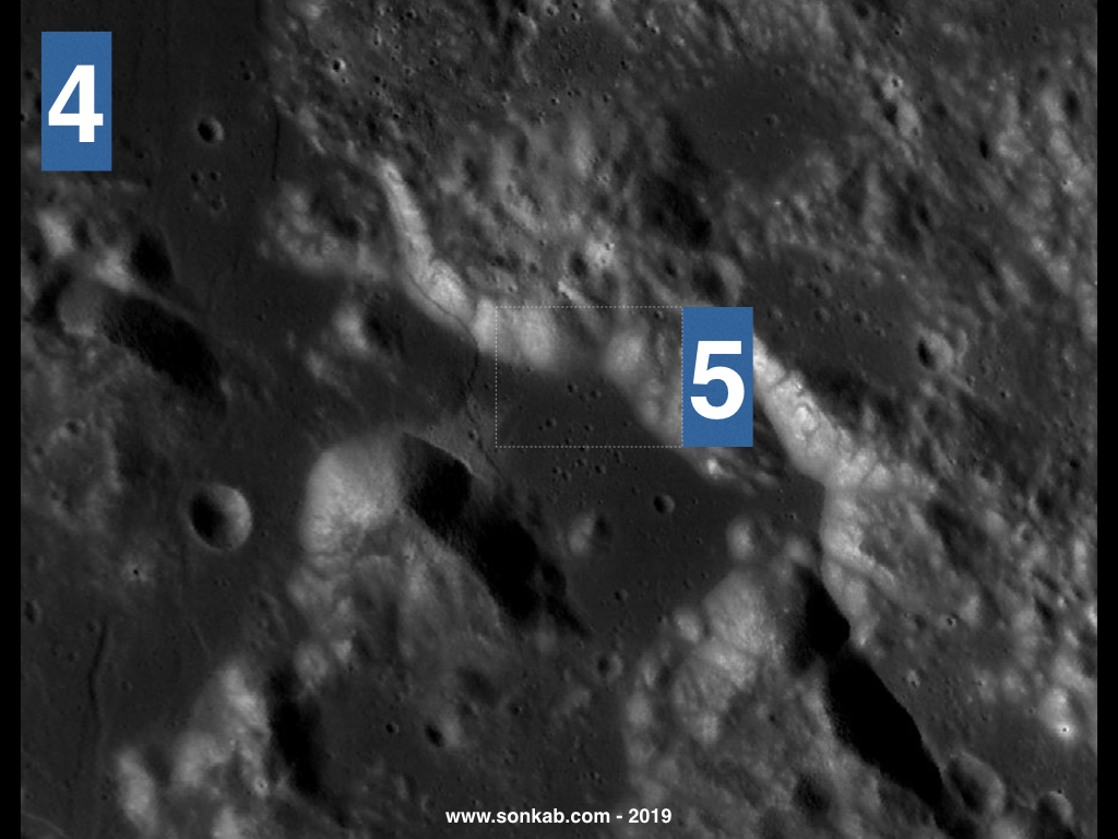 5. Dreptunghiul 5 mărit. Acum poți vedea trei cratere măricele aflate la baza unui deal denumit „masivul Nordic”. Triunghiul format din cele trei cratere se află în nordul văii Taurus-Littrow, o informație utilă dacă dorești să îți faci o casă de vacanță la munte. Craterul care este vârful triunghiului poartă numele unui fotbalist, „Shakespeare”, care a jucat pe la 1600 în echipa Angliei.