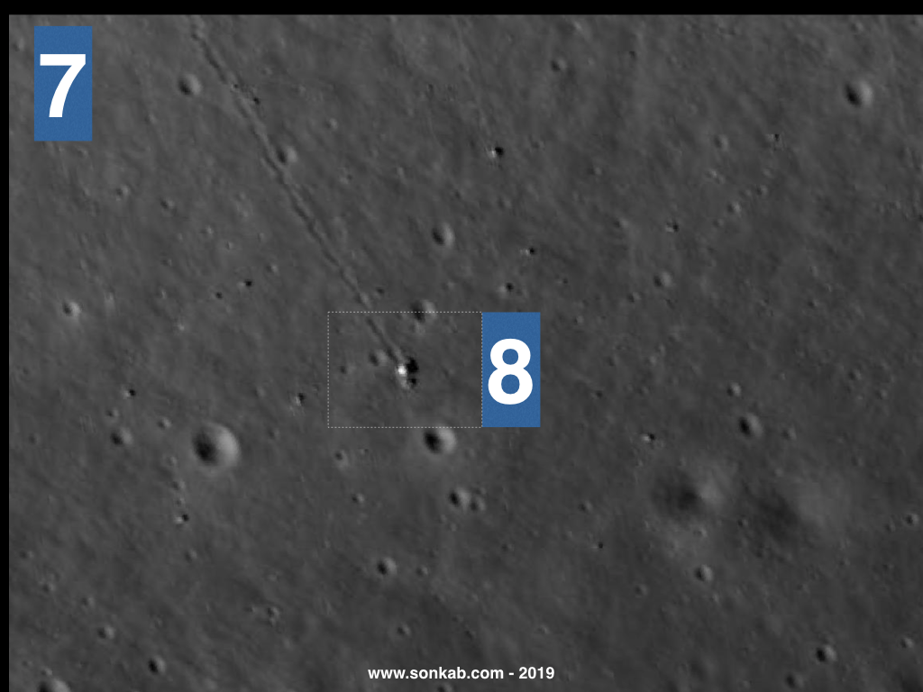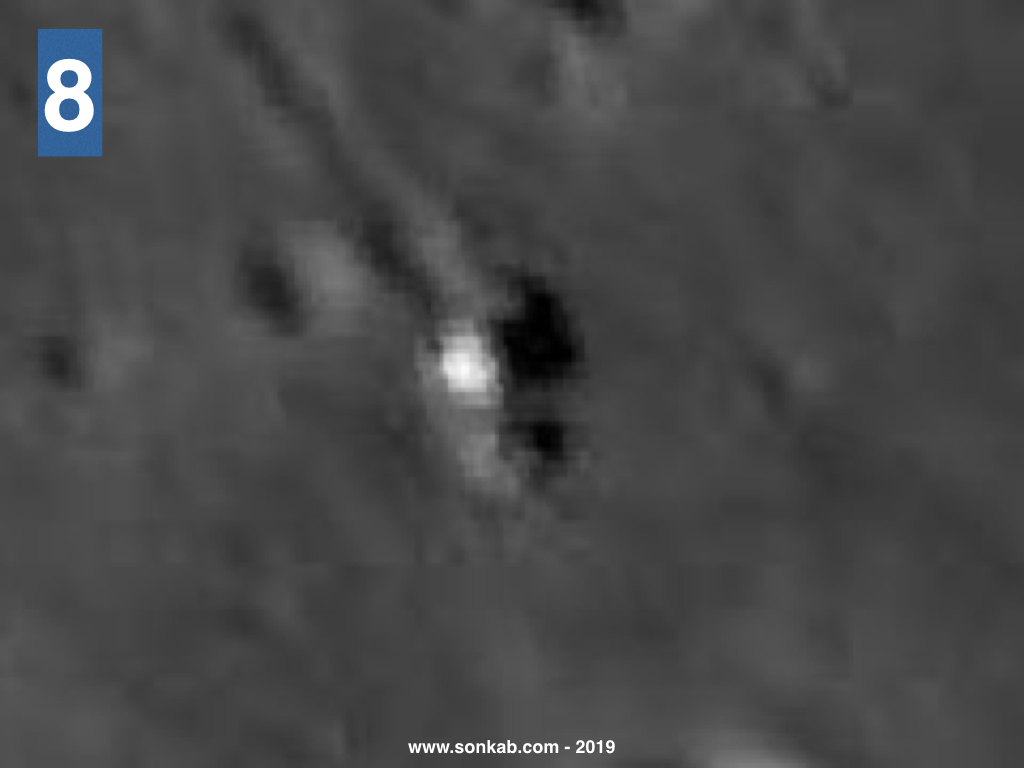 7. Am mărit. Bolovanul pare spart în două bucăți. Se mai întâmplă. Urma lăsată de el se întrerupe din loc în loc. Extratereștii? Nu, pur și simplu blovanul s-a rostogolit în salturi, iar atunci când nu a atins solul nu a deranjat praful selenar.