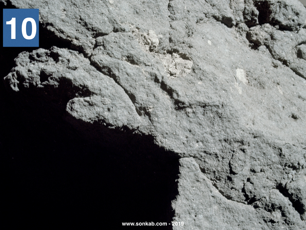 6. Panta și bolvanul. Acum te uiți pe panta masivului nordic, pe care vezi multe cratere mici, cel mai mare dintre ele având vreo 50 de metri. Sper însă că atenția îți este atrasă de obiectul din mijlocul imaginii, care nu este altceva decât un bolovan. Hmm, un bolovan în pantă. Nu sună bine.