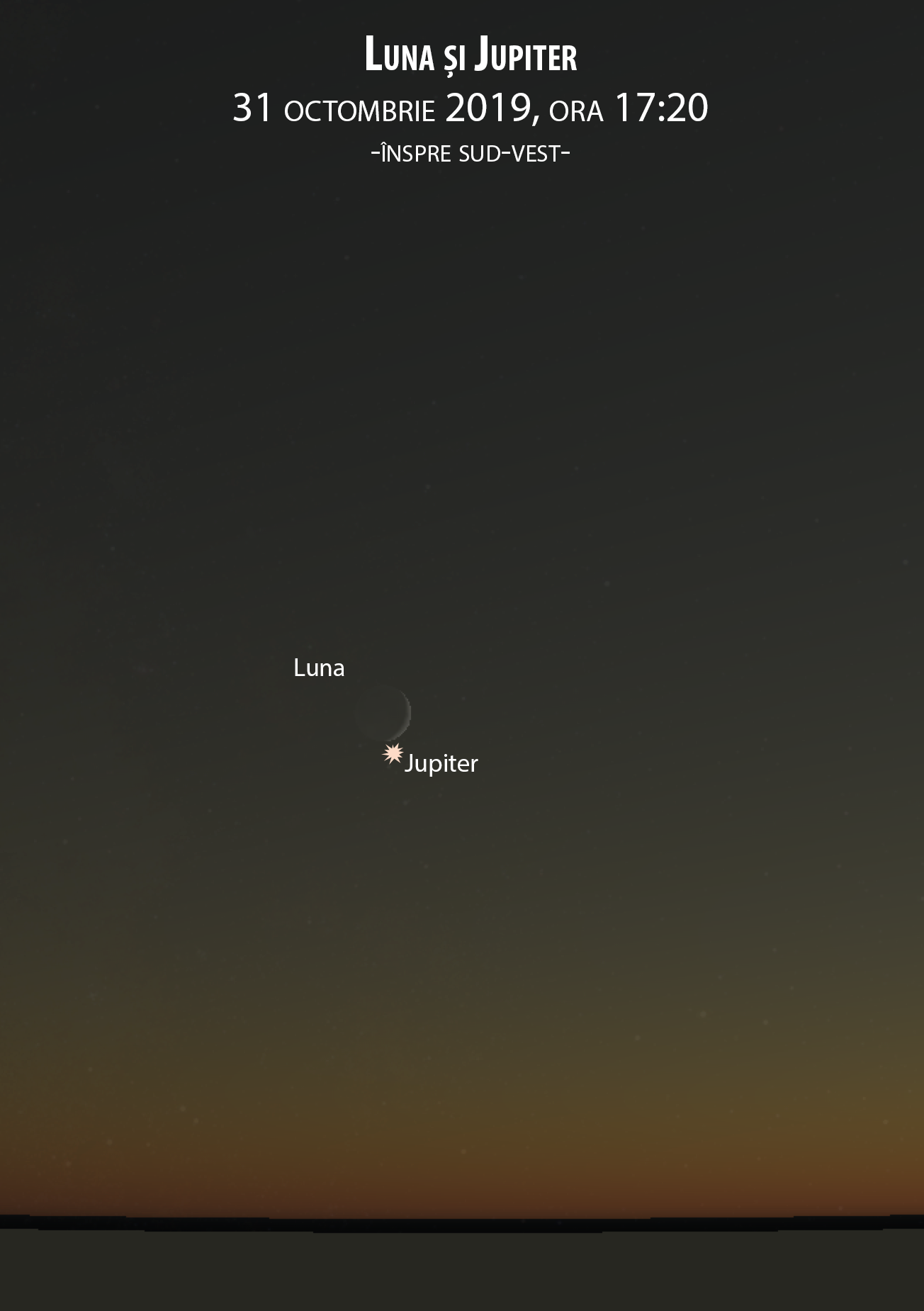 O asemenea priveliște este de ajuns dar pe 31 octombrie este doar începutul. Spun asta pentru că sub secera Lunii se află o stea foarte strălucitoare, o stea care este… planetă. Jupiter.