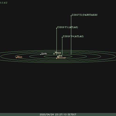 Se vede că la data de 24 aprilie cea mai apropiată cometa era C/2019 Y4, însă pentru că totul este în mișcare haideți să vedem cum vor modifica pozițiile.