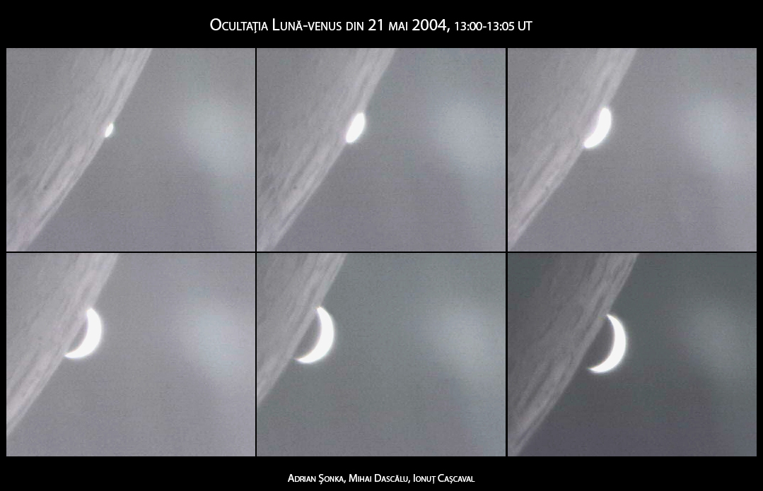 Prima ocultație este din 21 mai 2004, când Luna a trecut peste Venus, undeva în jurul orei 16. În colajul de mai jos se vede apariția planetei de după discul Lunii. Fazele Lunii și a planetei sunt mici, ceea ce înseamnă că nu se aflau departe de Soare, cam pe la 25 grade.