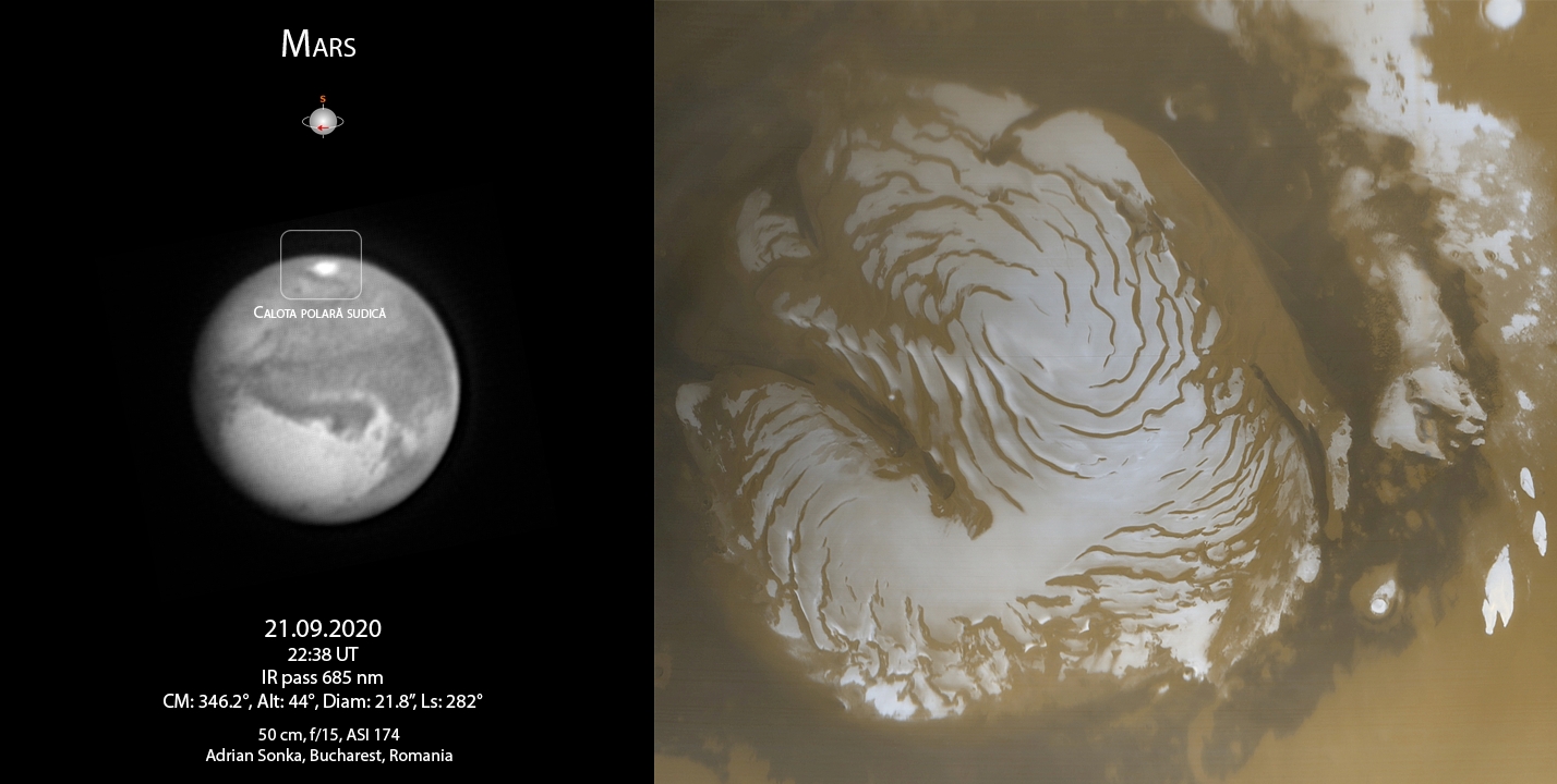 Și calotele polare „ne place”! Atunci când se văd ne amintesc de apa lichidă care se află sub toată gheața carbonică din care sunt compuse. Calotele se văd ca pete albe, mărginite de zone întunecate sau acoperite de nori străvezii. Mărimea lor scade sau crește de la o lună terestră la alta, așa că reprezintă un deliciu vizual.