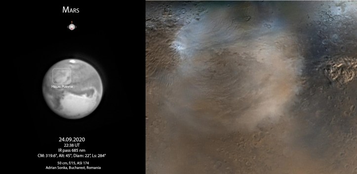 Vedem și zonele mai închise la culoare, „mările” marțiene, care sunt regiuni acoperite de rocă bazaltică, adică lavă solidificată. Chiar dacă nu putem vedea de departe, știm că acolo se află și cele mai multe cratere, unele bătute de vânt, iar altele înconjurate de sol îmbibat cu apă. Nu le vedem, repet, dar știm în ce zone se află, de aceea ne uităm cu plăcere la petele întunecate.