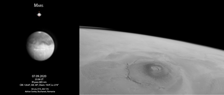 Sau Olympus Mons, un vulcan enorm, atât de înalt încât s-ar vedea de la 400 de km depărtare. Înalt și mare ca diametru, baza fiind cât țara noastră. Când îl vezi nu poți să nu te gândești cum timp de milioane de ani mii și miliarde de tone de lavă a ieșit din interior și s-a răcit în timp ce curgea la vale. Rezultatul este acest tăcut gigant, care se vede ca o simplă pată de pe Pământ.