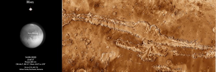 De exemplu, Valles Marineris, o scobitură lungă de 4000 de kilometri și adâncă de 6, care face ca orice canion de pe Terra să pară o crăpătură în asfalt. Văzut de pe Marte ar fi o priveliște care ar face orice zi mai frumoasă, fie că de uiți cum dispare sub orizont, fie că te uiți în adâncimea lui monstruoasă, dar de aici, de la depărtare, se vede ca o simplă dungă.