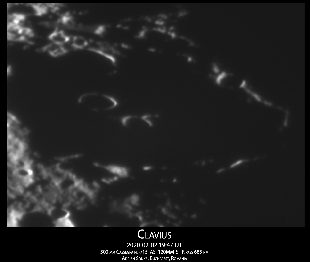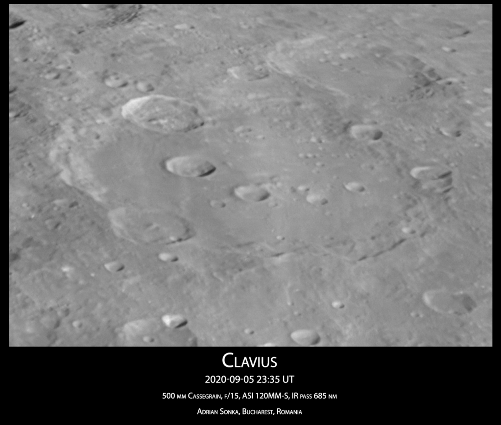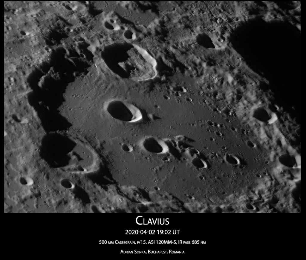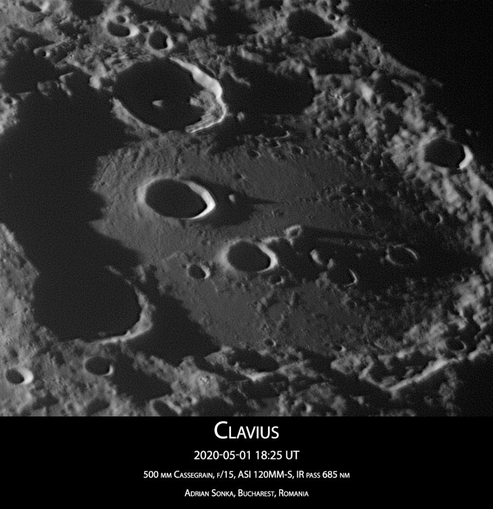 Acum intră în scenă craterul Clavius, un crater între cratere, mare cât distanța București-Constanța. Este locuit de alte cratere, mari și mici, și se află la 900 de km de Polul Sud, în regiunea vizibilă de pe Pământ.