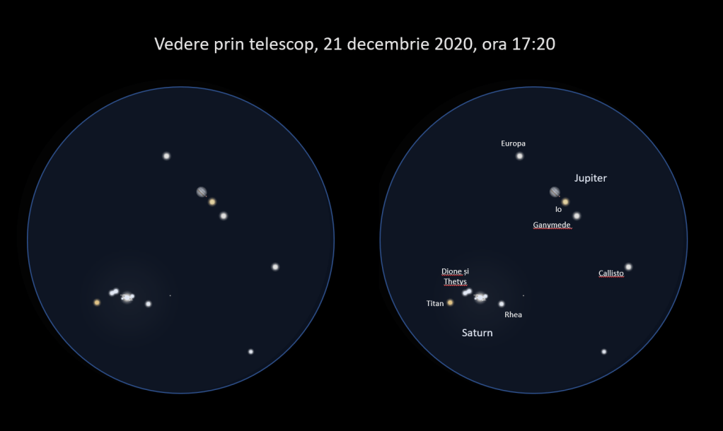 Iată o simulare pentru data de 21 decembrie, ora 17:20, printr-un telescop de 200 mm, la puterea de 100x.