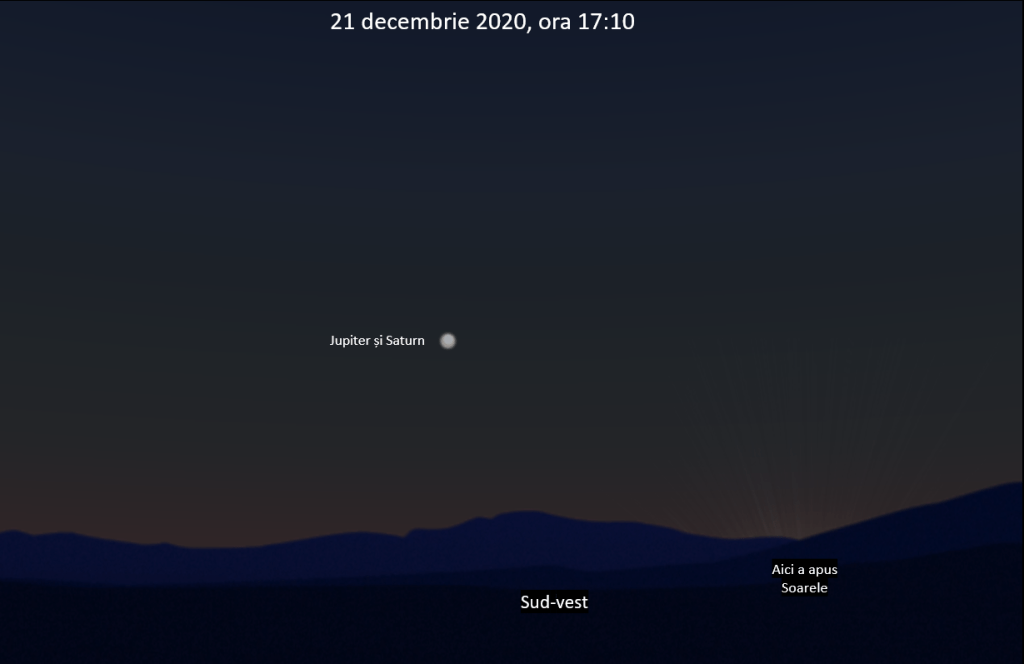 Conjuncția (apropierea) se produce pe 21 decembrie, când cele două planete se vor afla la doar 6 minute de arc una de alta, atât de aproape încât se vor vedea ca o stea dublă, strălucitoare.