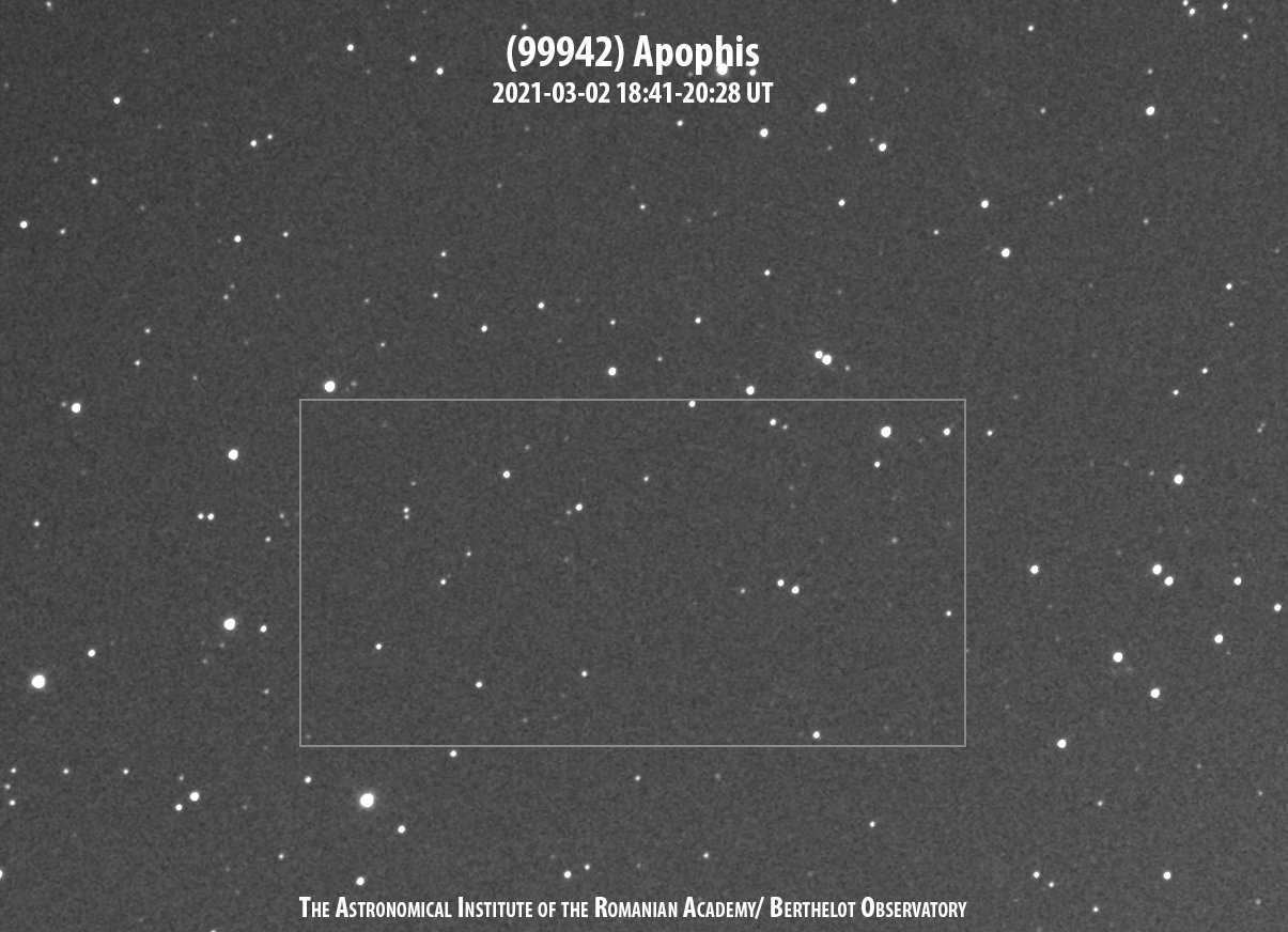 March 4, 2021October 10, 2025 sonkab Asteroidul Apophis în noaptea de 2 spre 3 martie Asteroidul (99942) Apophis s-a aflat la doar 16,9 milioane de km depărtare de noi în seara de 2 spre 3 martie. Se mișca repede printre stelele din constelația Hydra. L-am observat fără milă timp de câteva ore. Share this: Click to email a link to a friend (Opens in new window) Email Click to share on Facebook (Opens in new window) Facebook Click to share on X (Opens in new window) X Like Loading... Related