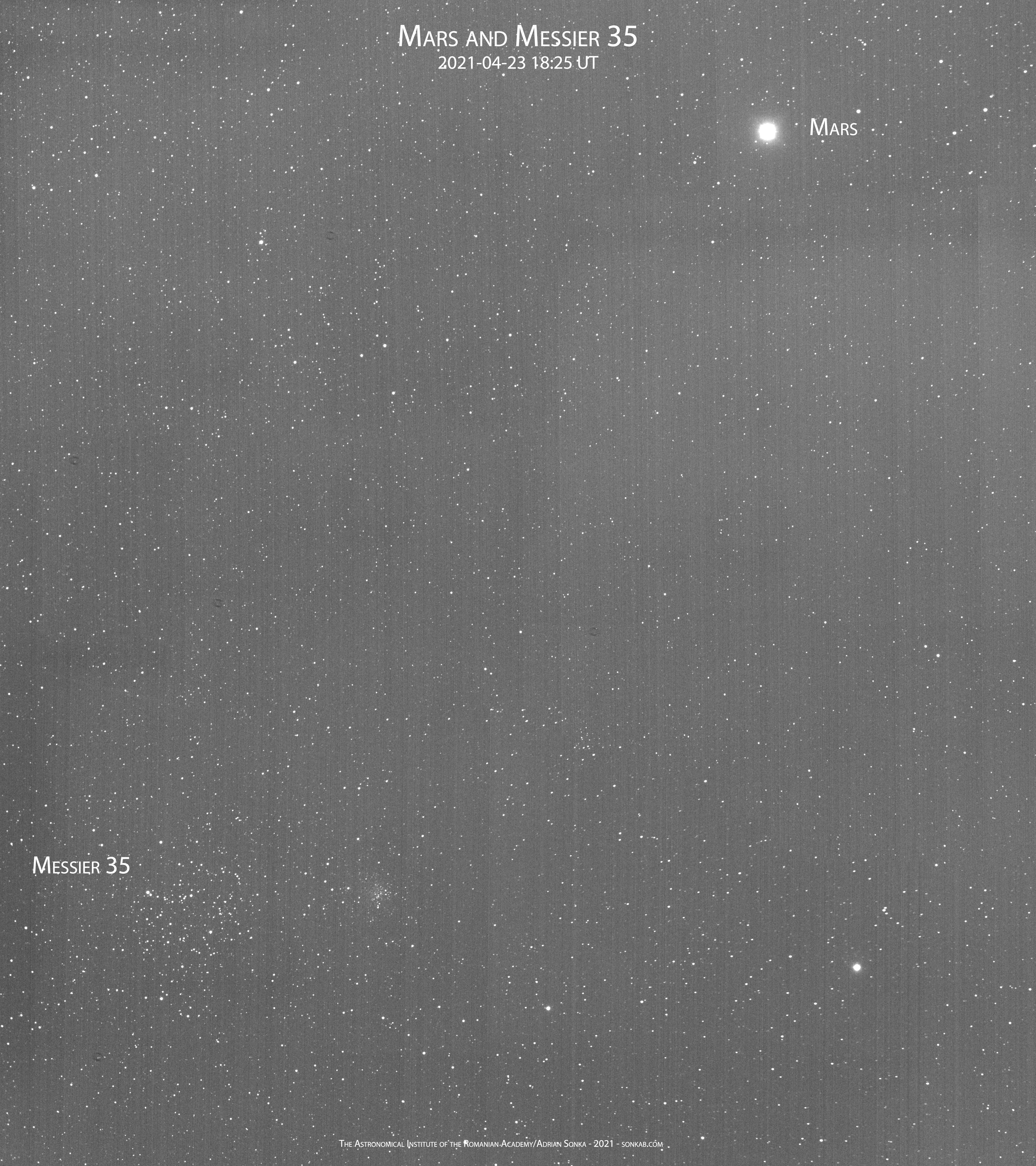 Marte se află în constelația Gemini, Messier 35 la fel. Marte, pentru că este o planetă și se află aproape de Soare și Pământ, se mișcă printre stele, Messier 35, care se află pe la 2700 de ani lumină, nu.