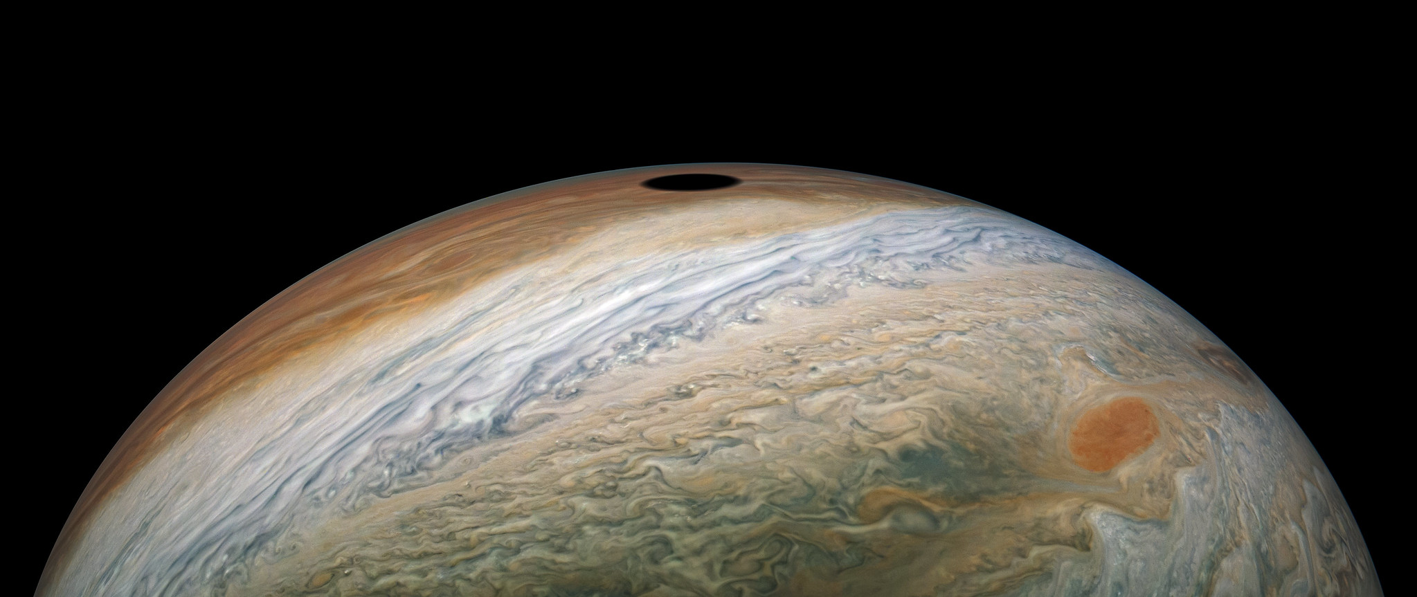 A doua imagine este luată pe 11 septembrie 2019 de către sonda spațială Juno. Planeta este Jupiter, iar pe ea se văd nori reci (albi), calzi (rosiatici) și o umbră mare, care este lăsată pe nori de satelitul Io.