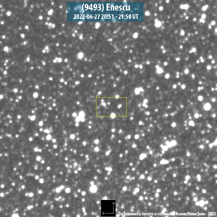 În acest câmp bogat în stele din constelația Ophiucus se mișcă asteroidul cu nume românesc (9493) Enescu. Am observat în noaptea de 27 iunie 2022, iar asteroidul nu este foarte strălucitor (mag 18,2).