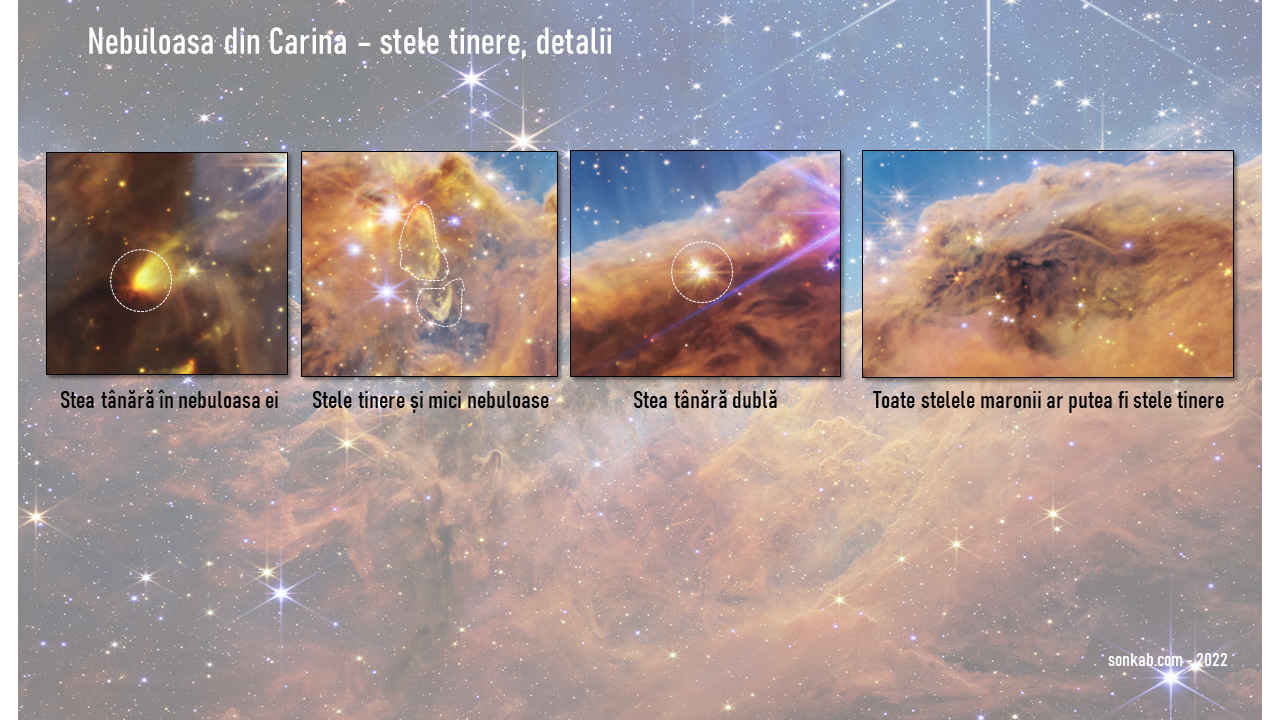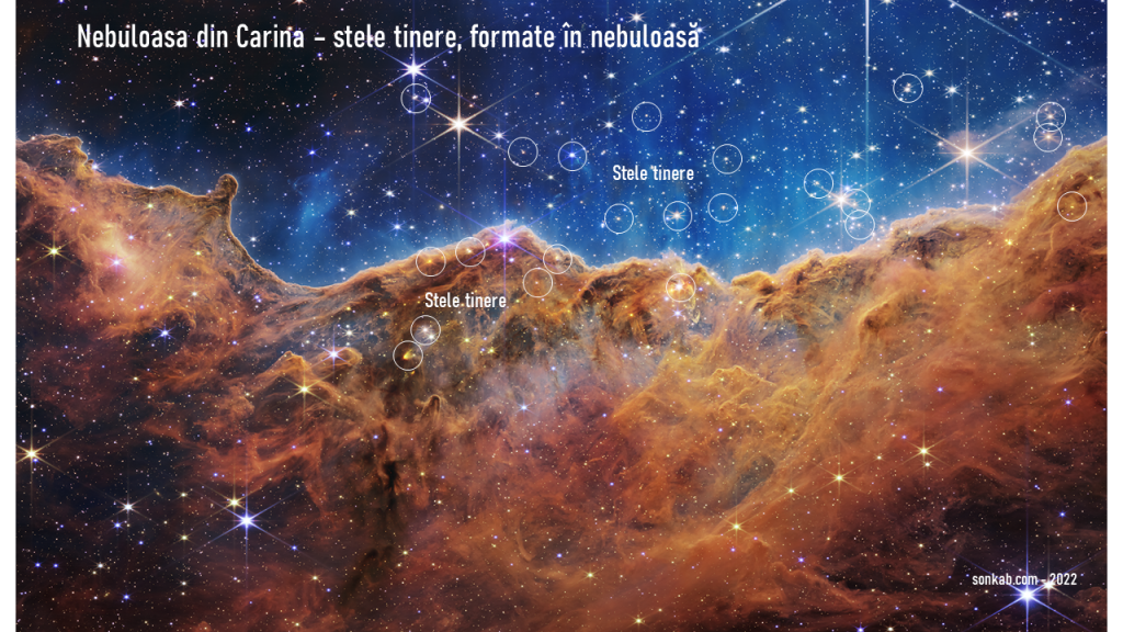 Iată mai jos, încercuite, stelele tinere cunoscute până când să apară imaginea lui James Webb. Una din ele pare dublă, cu toate că până acum se știa că este singură.