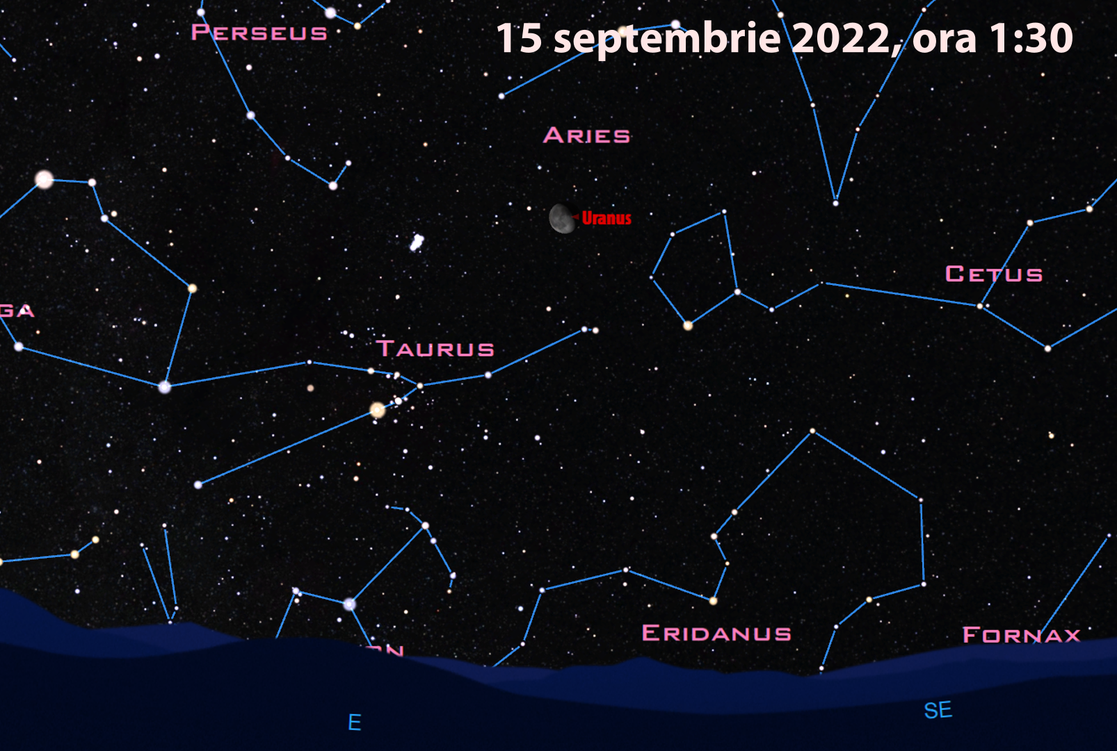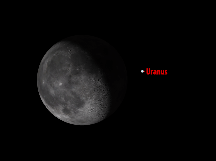 Se va vedea bine, dar lângă ea, în dreapta, se vede o mică steluță. Aceea este planeta Uranus, care se întâmplă să fie în calea Lunii.