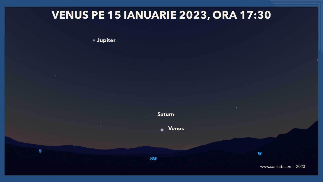 Venus se mișcă repede pe cer și se întâlnește cu diferite obiect, planete sau stele. Între 21 și 24 ianuarie trece pe lângă Saturn. Caută-le pe ora 17, înspre apus.