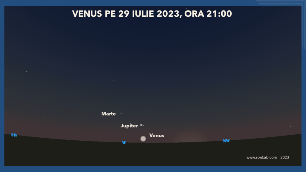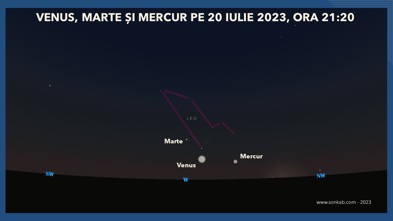 Imediat după apusul Soarelui se văd trei planete pe cer, în aceeași direcție: Mercur, Venus și Marte. Luna apare și ea între 19 și 21 iulie.