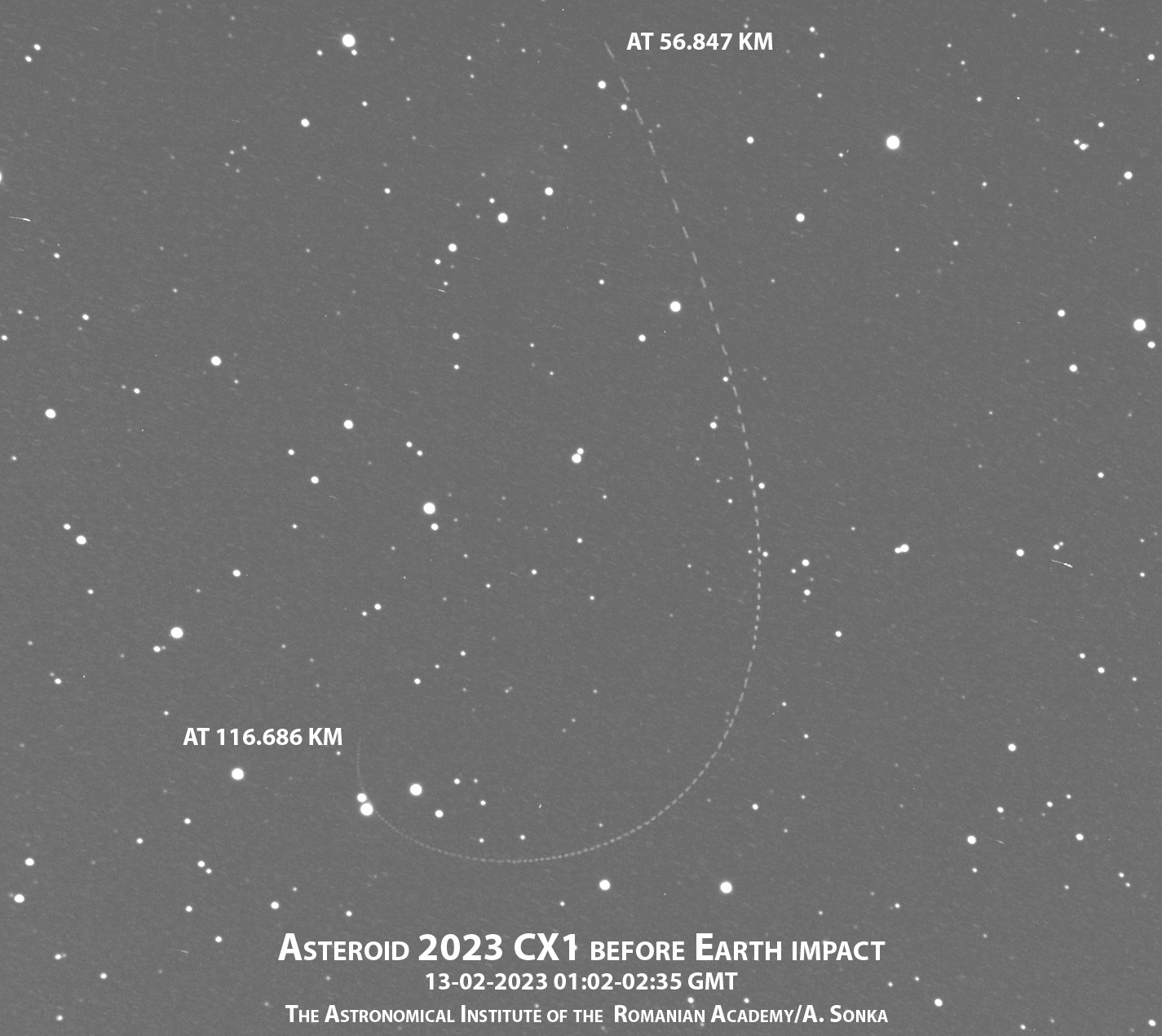 Mai jos vedeți cum s-a mișcat asteroidul pe cer timp de 1h și 30 de minute. Obiectul apare în stânga jos, se mișcă spre centru jos, după care urcă spre marginea de sus a imaginii.