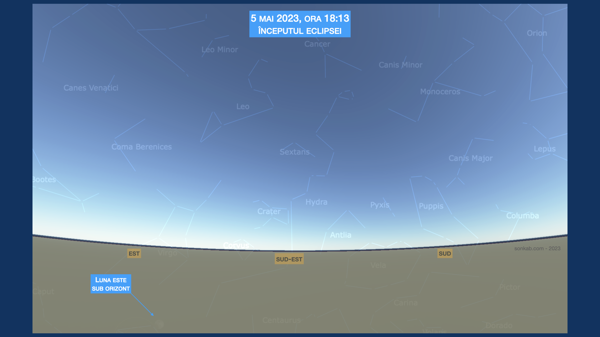 Eclipsa începe la ora 18:13 când Luna este sub orizont. Oriunde te-ai afla în țara noastră Luna este mult sub orizont când începe să intre în penumbră.