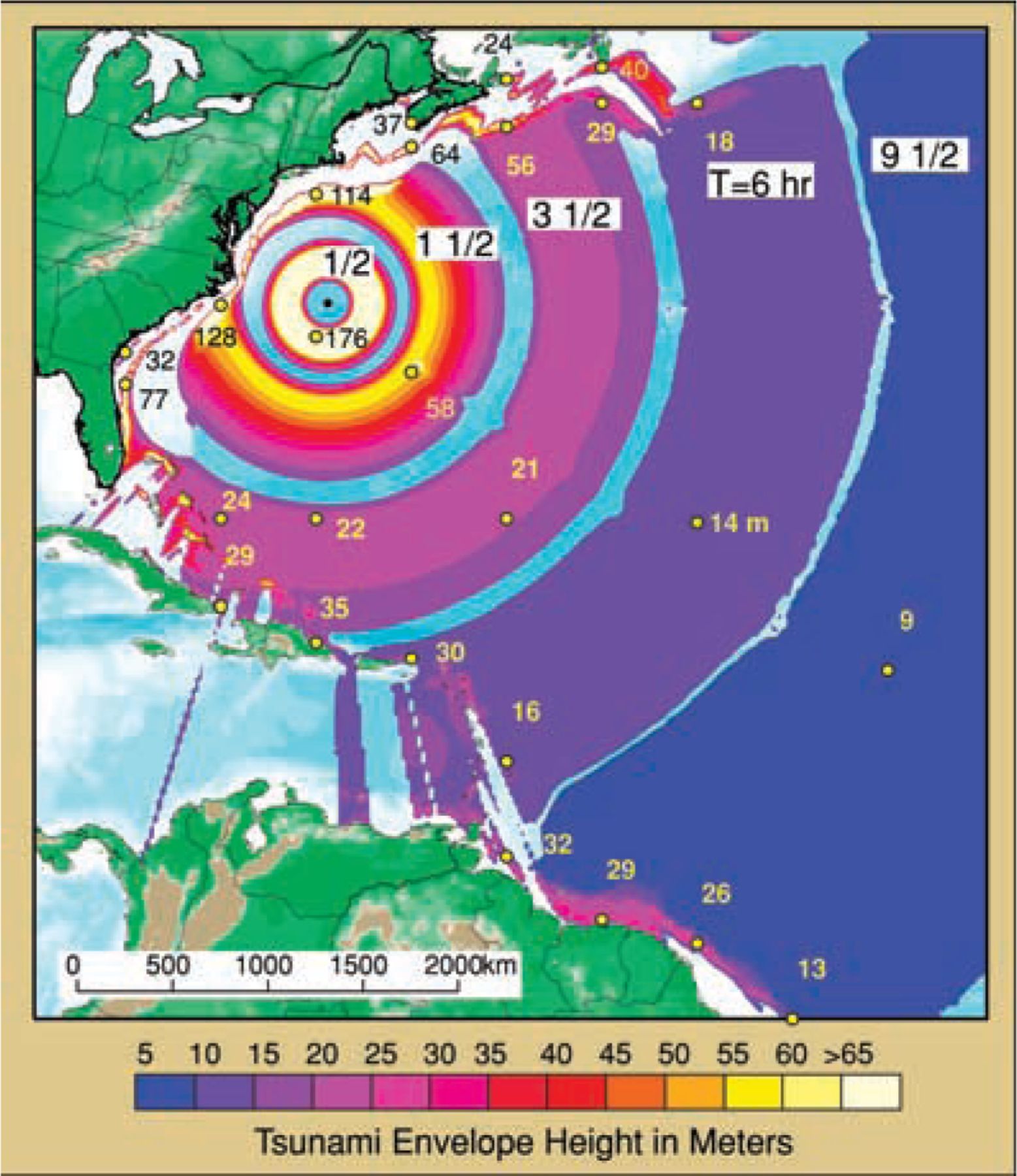 Valuri înalte de 20 m ar fi ajuns și în Europa după 12 ore, destul de înalte pentru a inunda mulți kilometri de uscat.