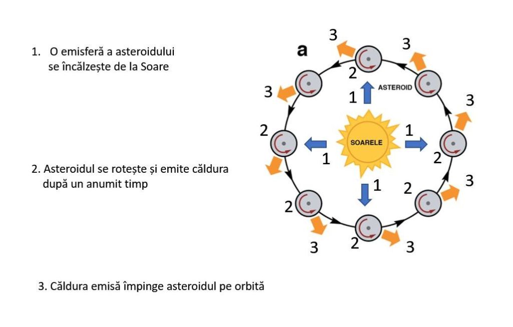 Da, este atât de simplu. Când asteroidul este bătut de lumina Soarelui suprafața lui se încălzește și emană în spațiu căldura. Simpla emanare de căldură funcționează ca un mini-motor de rachetă, iar în timp, traiectoria asteroidului se modifică.
