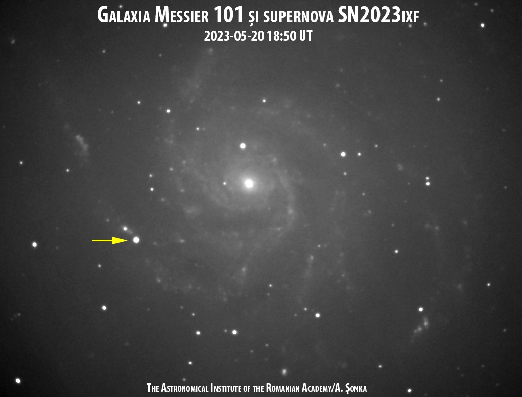 Mai jos vedeți o imagine cu galaxia Messier 101 și supernova recent apărută într-unul din brațele spirale.