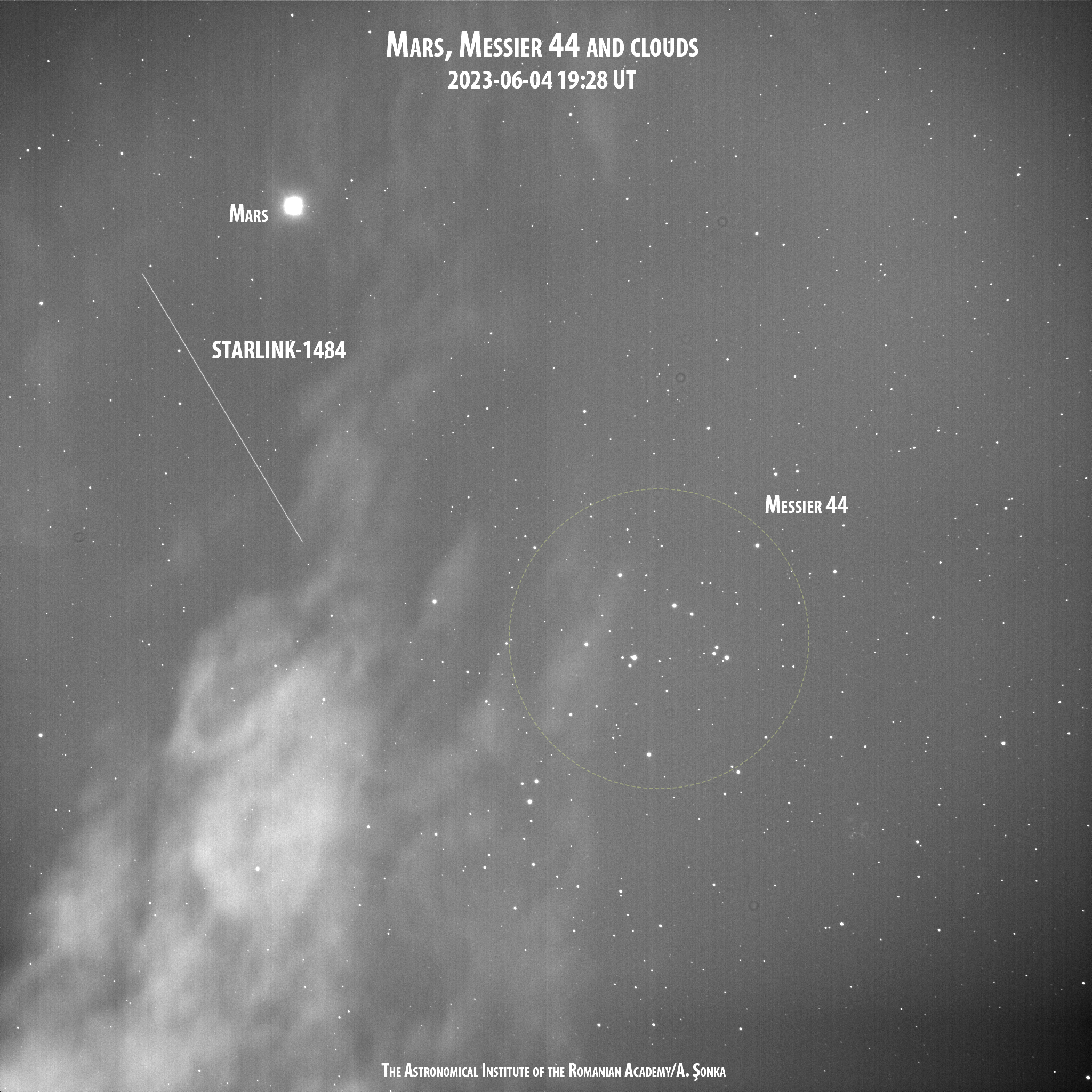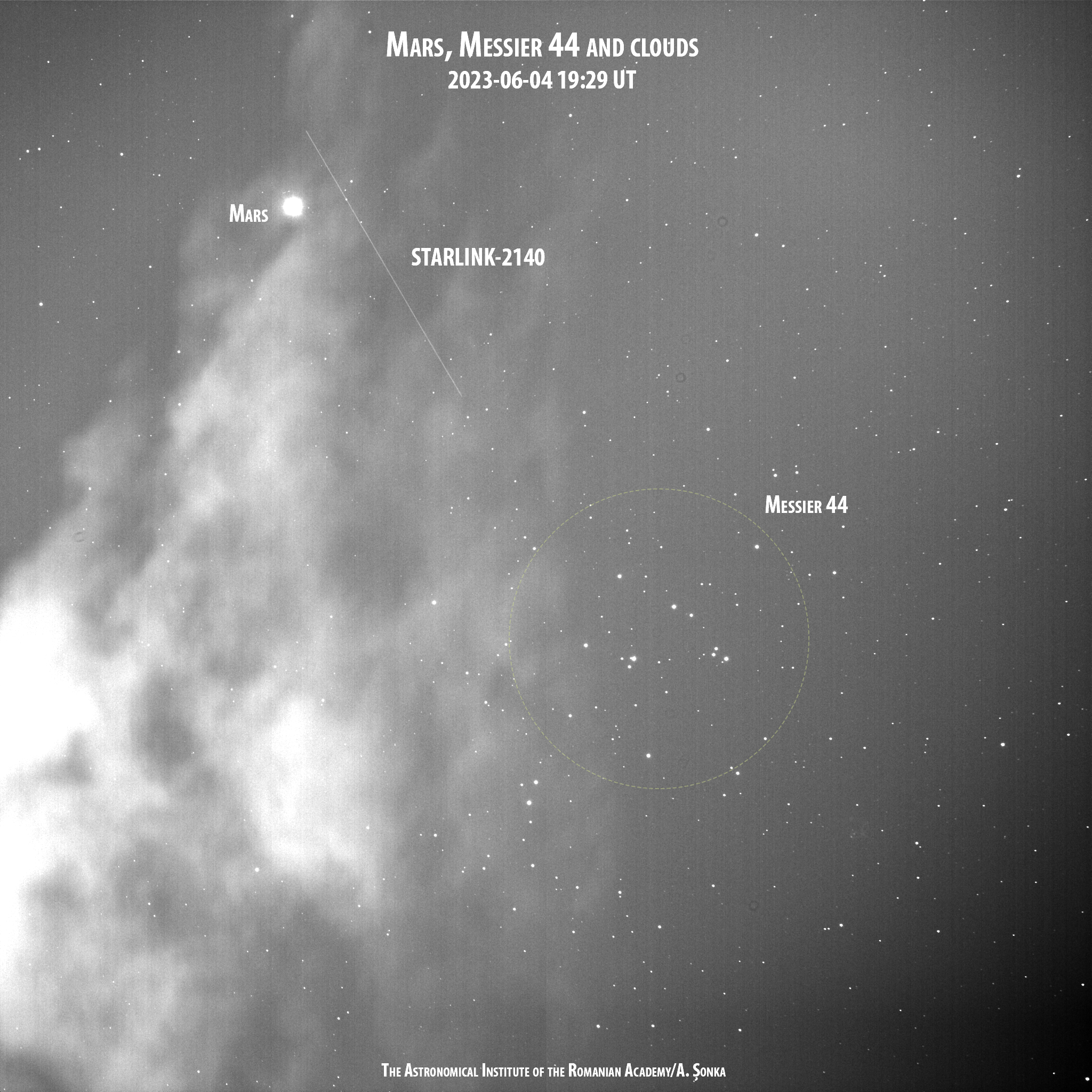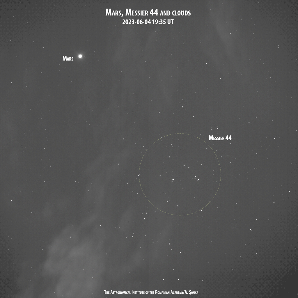 La începutul lunii iunie planeta Marte s-a aflat pe cer în dreptul roiului stelar Messier 44 din constelația Cancer.