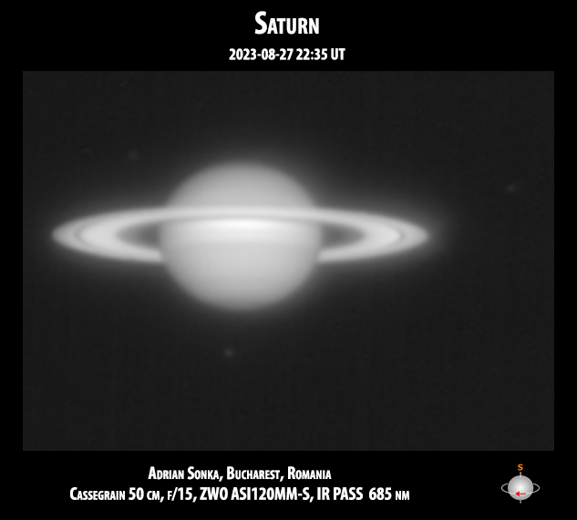 August 30, 2023 sonkab Saturn la opoziție – 2023 Pe 27 august Saturn s-a aflat la cea mai mică depărtare de Pământ, care este enormă: 1,3 miliarde km. Iată-l, la doar 13 ore după apropierea minimă, împreună cu trei sateliți. Share this: Click to email a link to a friend (Opens in new window) Email Click to share on Facebook (Opens in new window) Facebook Click to share on X (Opens in new window) X Like Loading... Related