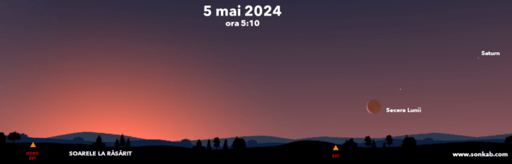 Poți vedea prima seceră chiar în dimineața de 5 mai, pe la ora 5. Se va afla înspre est, nu foarte sus pe cer, în dreapta locului de răsărit al Soarelui.