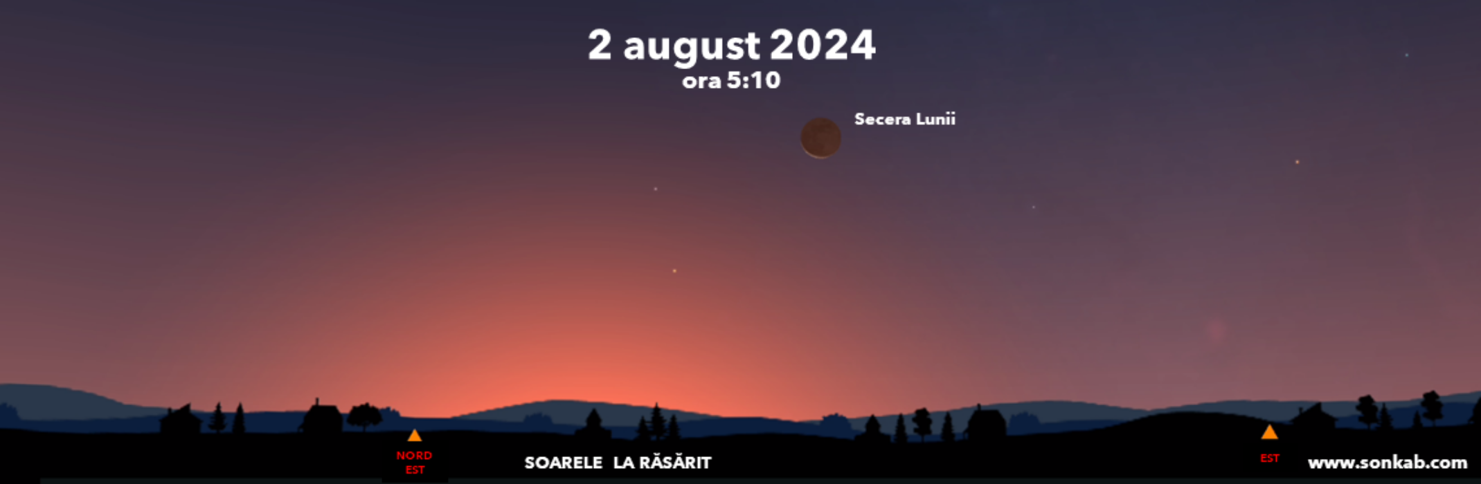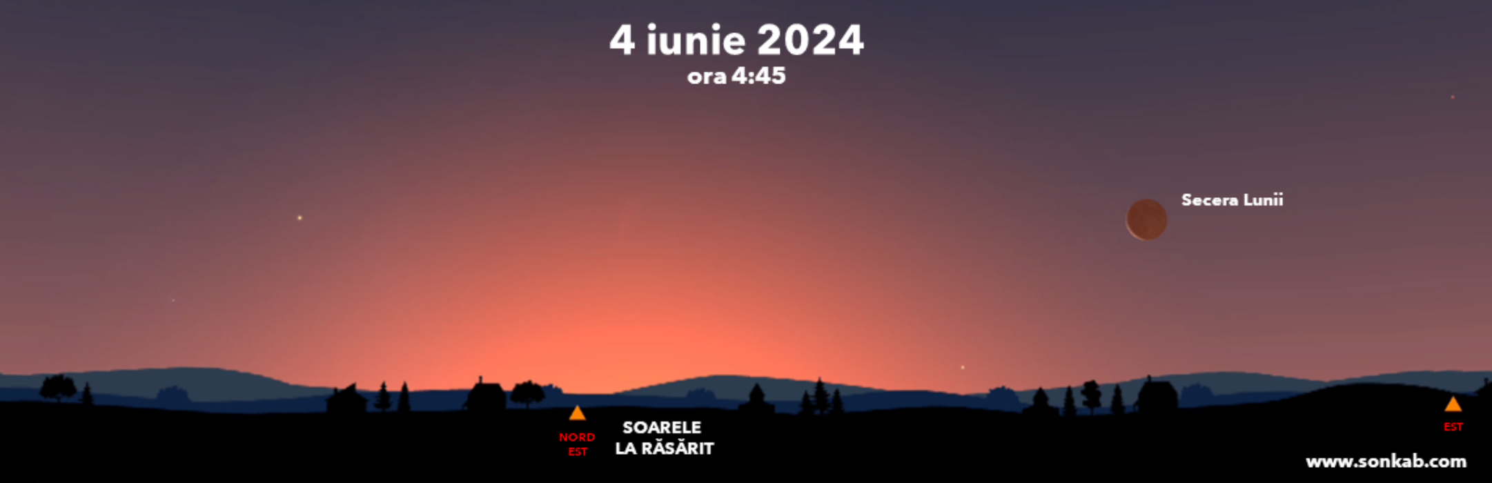 Luna va fi jos față de orizont, în dreapta răsăritului, iar mai departe spre dreapta se vede și Jupiter.