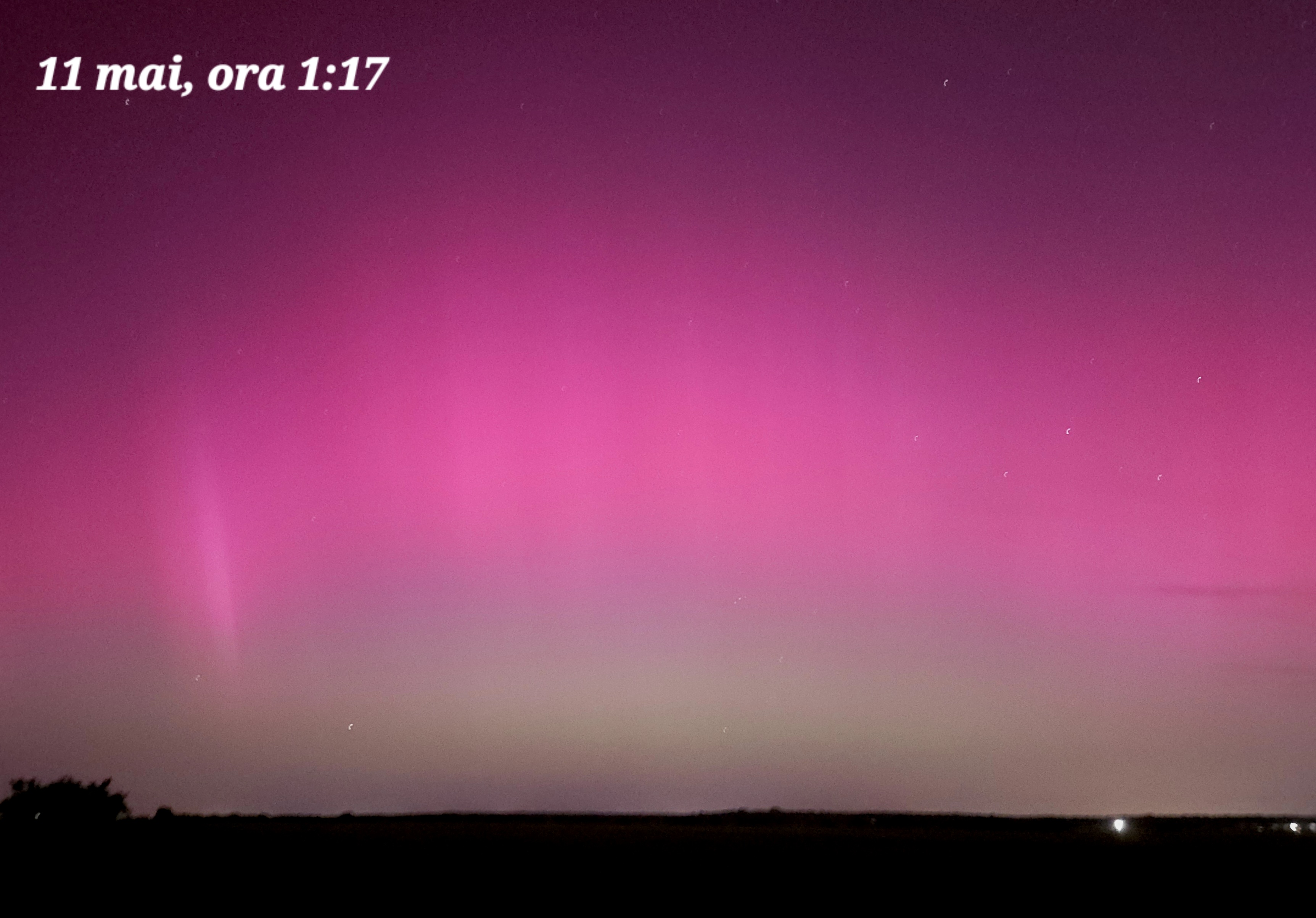 De la ora 1 fenomenul s-a văzut ușor cu ochiul liber, înspre nord. Perdelele roz s-au ridicat pe cer până la 40 grade înălțime, înspre nord. La orizont s-a văzut mai mereu partea verde a aurorei.