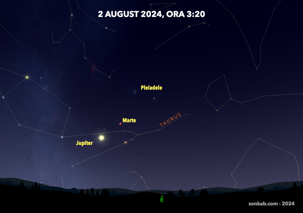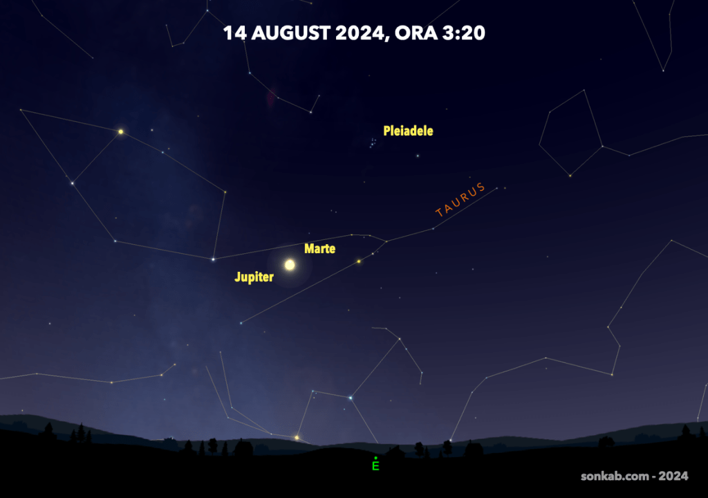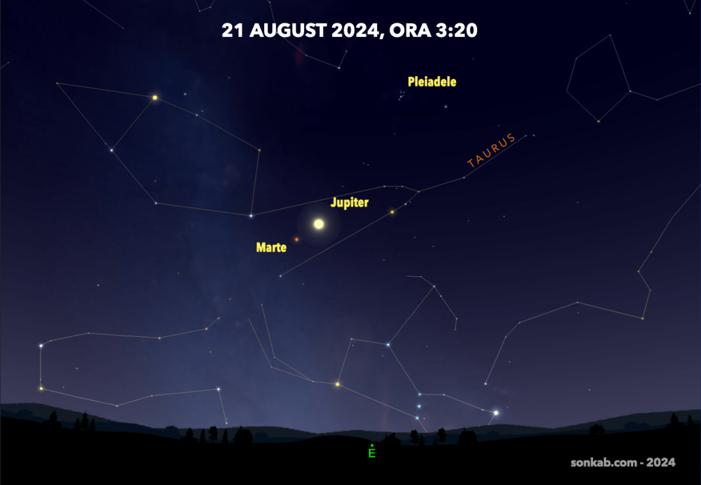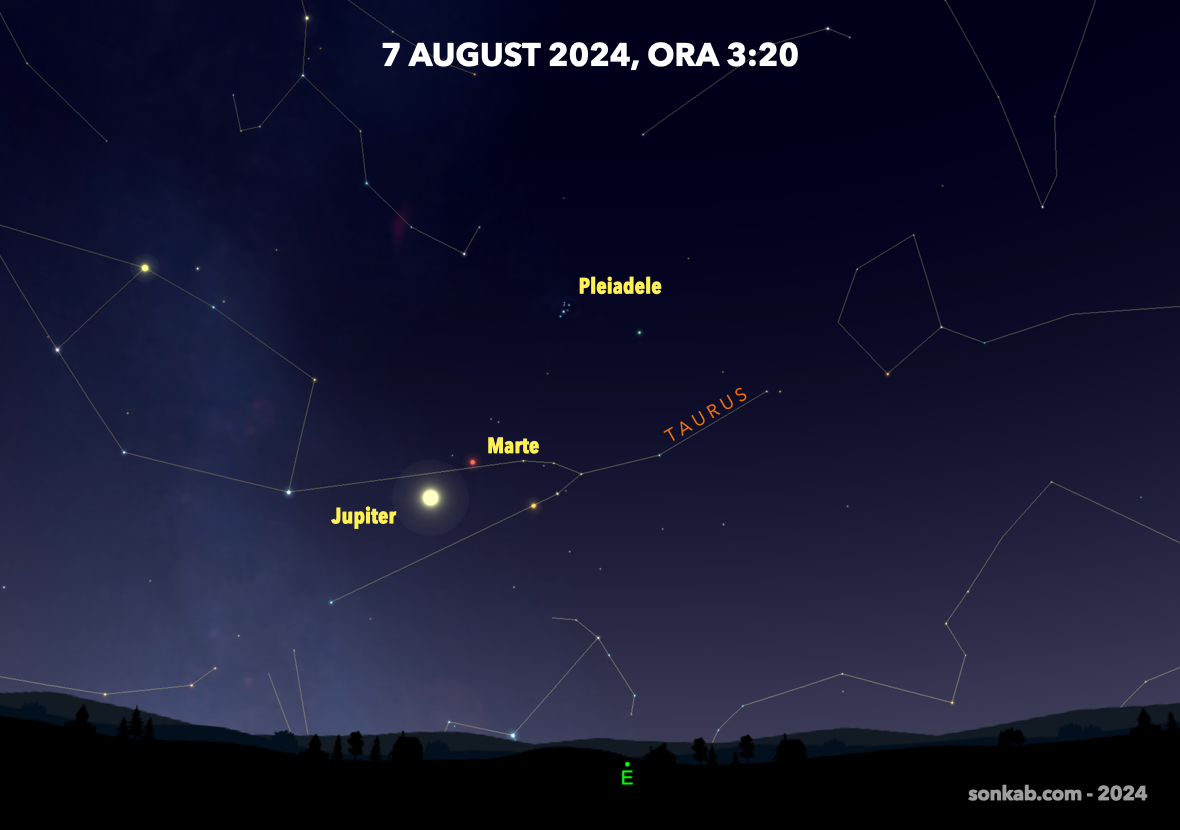Începe de la 1 august, caută-l pe Jupiter și îl vei găsi pe Marte în dreapta sus, nu foarte departe. În prelungirea lor se vede și roiul stelar Pleiade, așa că nu te vei plictisi.
