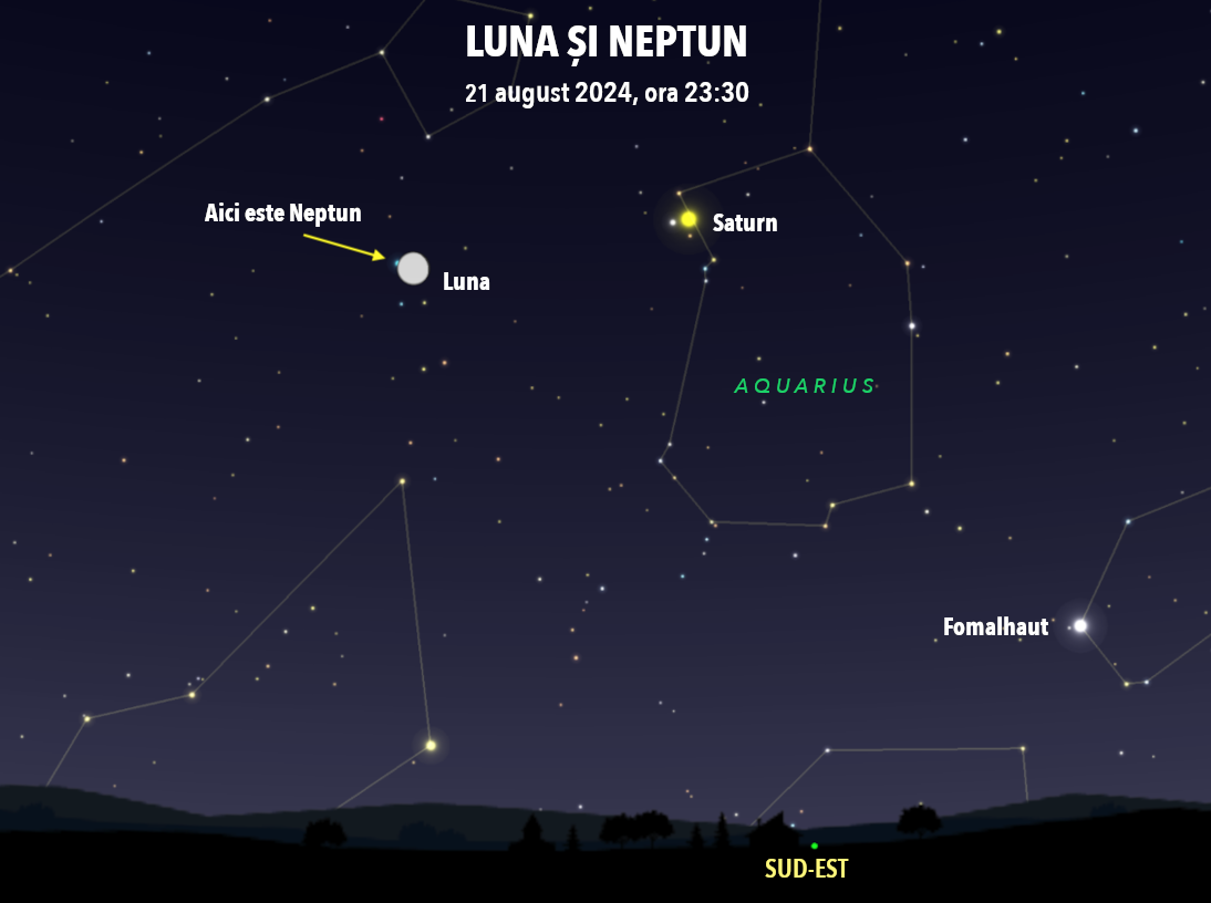 Miercuri noapte (21 spre 22 august) Luna se va afla lângă planeta Neptun, care nu se vede cu ochiul liber.