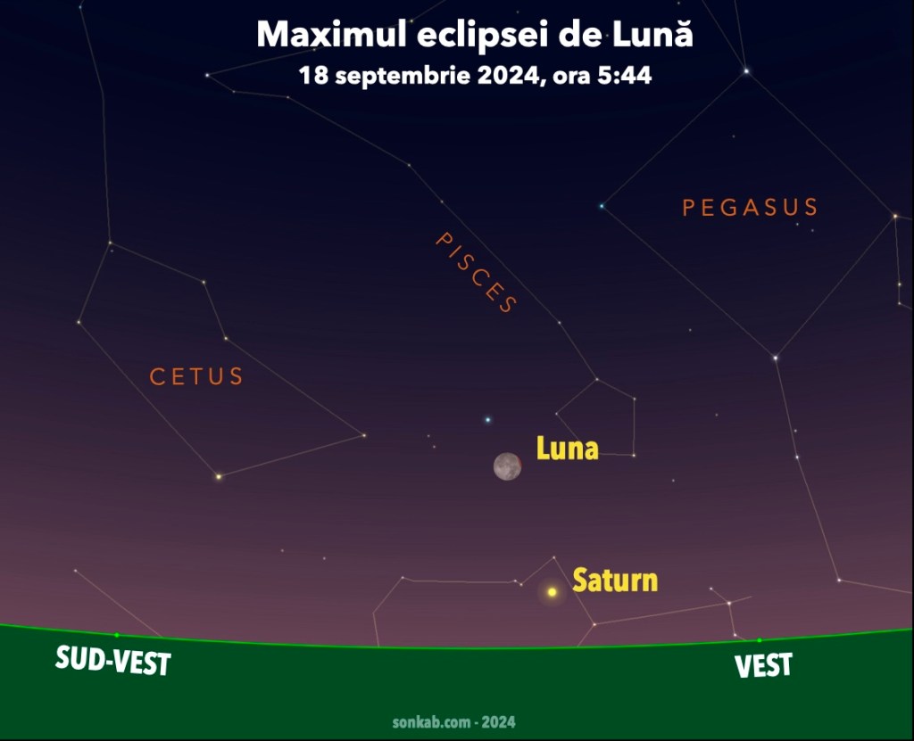 Luna se află în constelația Pisces și este încadrată de Saturn (aflat mai jos, aproape de orizont) și Neptun (care nu se vede cu ochiul liber).