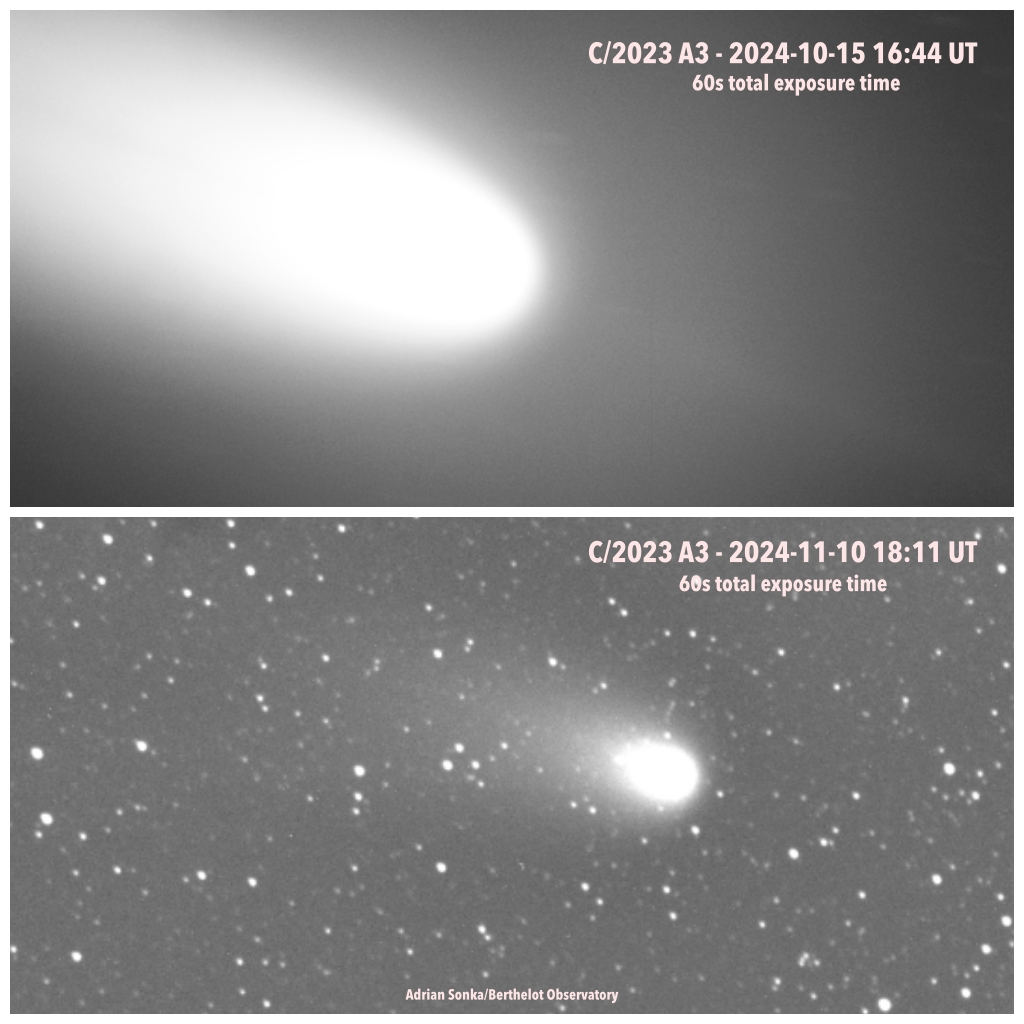 Imaginea de sus este realizată prin însumarea a 60 de imagini luate cu 1s timp de expunere din seara de 15 octombrie 2024. Coada mare este îndreptată în stânga-sus și iese din imagine. În dreapta se vede și anticoada.