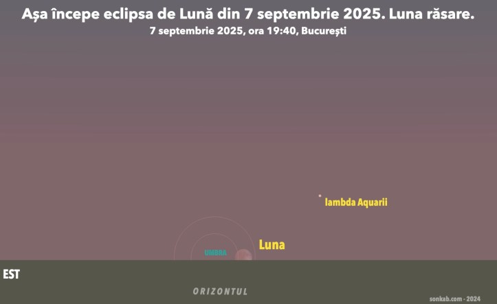 Pe 7 septembrie Luna intră iar în umbra Pământului, dar noi vom vedea ceva de abia la mijlocul fenomenului, când răsare.