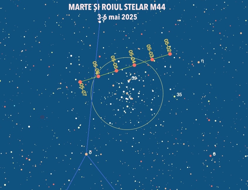 În luna mai planeta Marte se mișcă rapid printre stele și trece pe la marginea unuia dintre cele mai frumoase aglomerări de stele de pe cer, Messier 44, aflat în constelația Cancer.