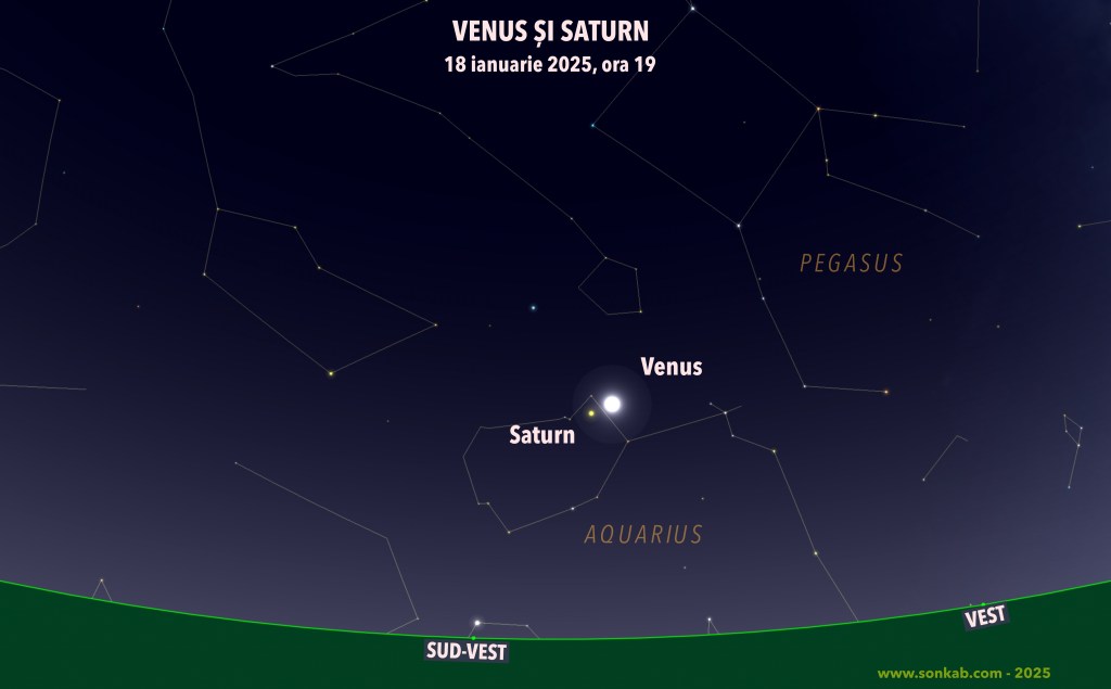 Venus se mișcă mai repede decât Saturn, îl va ajunge și se va afla destul de aproape de el în seara de 18 ianuarie. De fapt, cele două planete se vor afla aproape una de alta în intevalul 15-22 ianuarie.