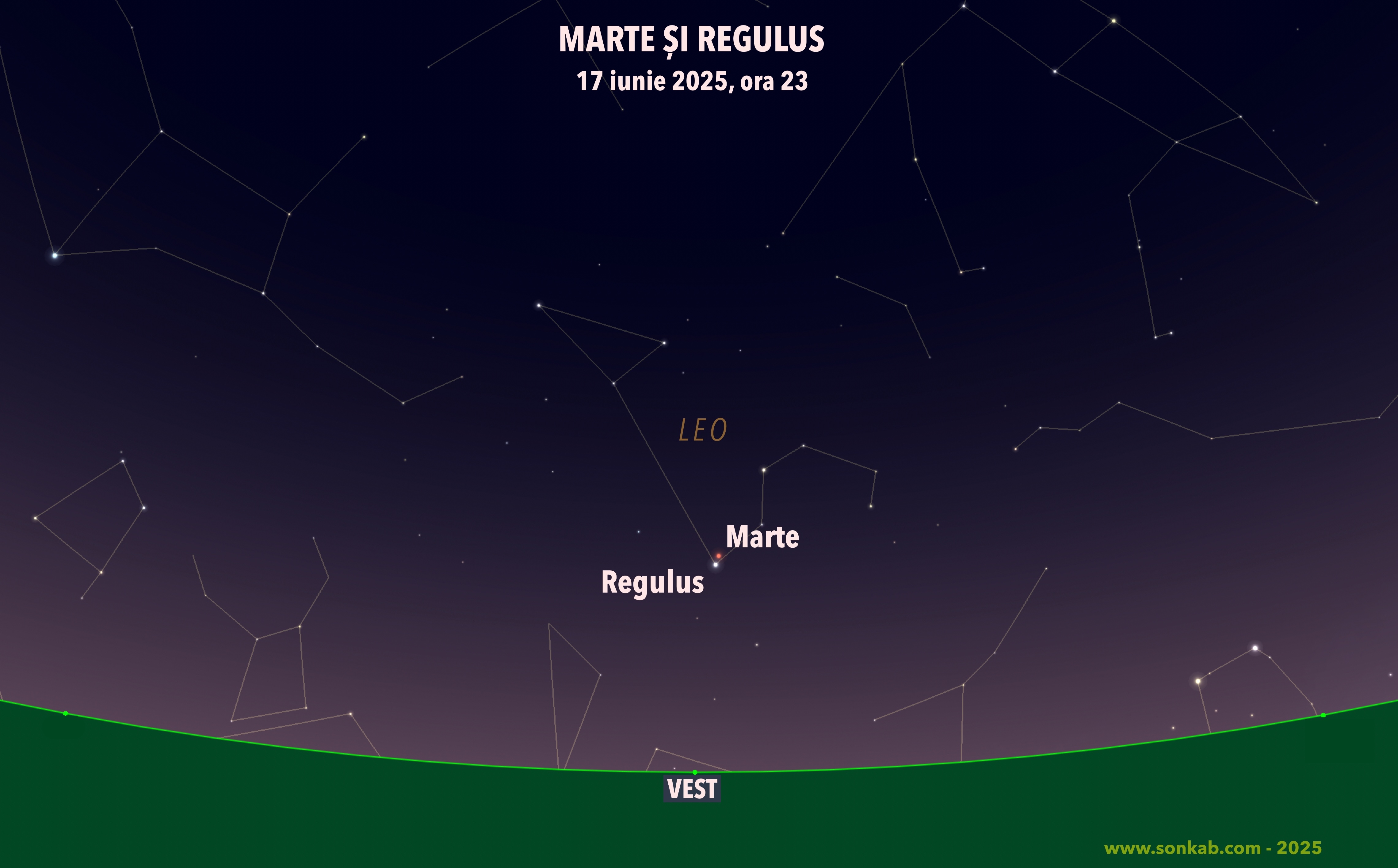 În serile de 15-19 iunie Marte va deranja constelația Leo pentru că va trece pe lângă cea mai strălucitoare stea de acolo, denumită Regulus.