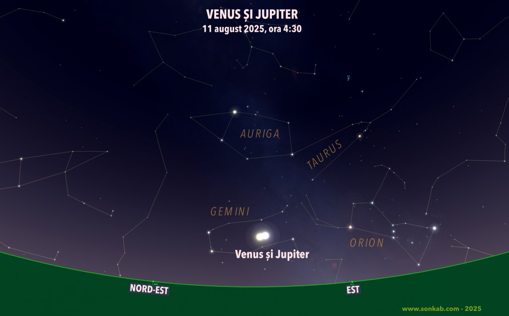În luna august, Venus și Jupiter se vor vedea aproape una lângă alta înainte de răsăritul Soarelui, în constelația Gemini.