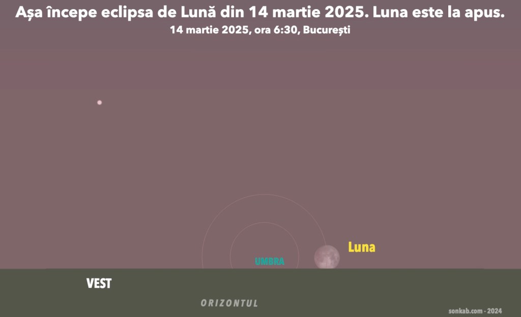 Pe 14 martie 2025, la ora 5 57 dimineața, începe să se producă o eclipsă de Lună, care se va termina după doar 50 de minute, când apune Luna.