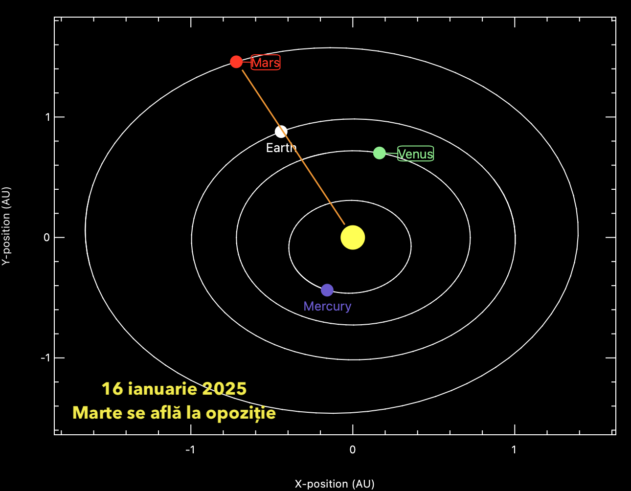 Pe 12 ianuarie Marte s-a afla la 96.000.000 km de Pământ, iar pe 16 se va afla la opoziție, sus pe cer la miezul nopții.