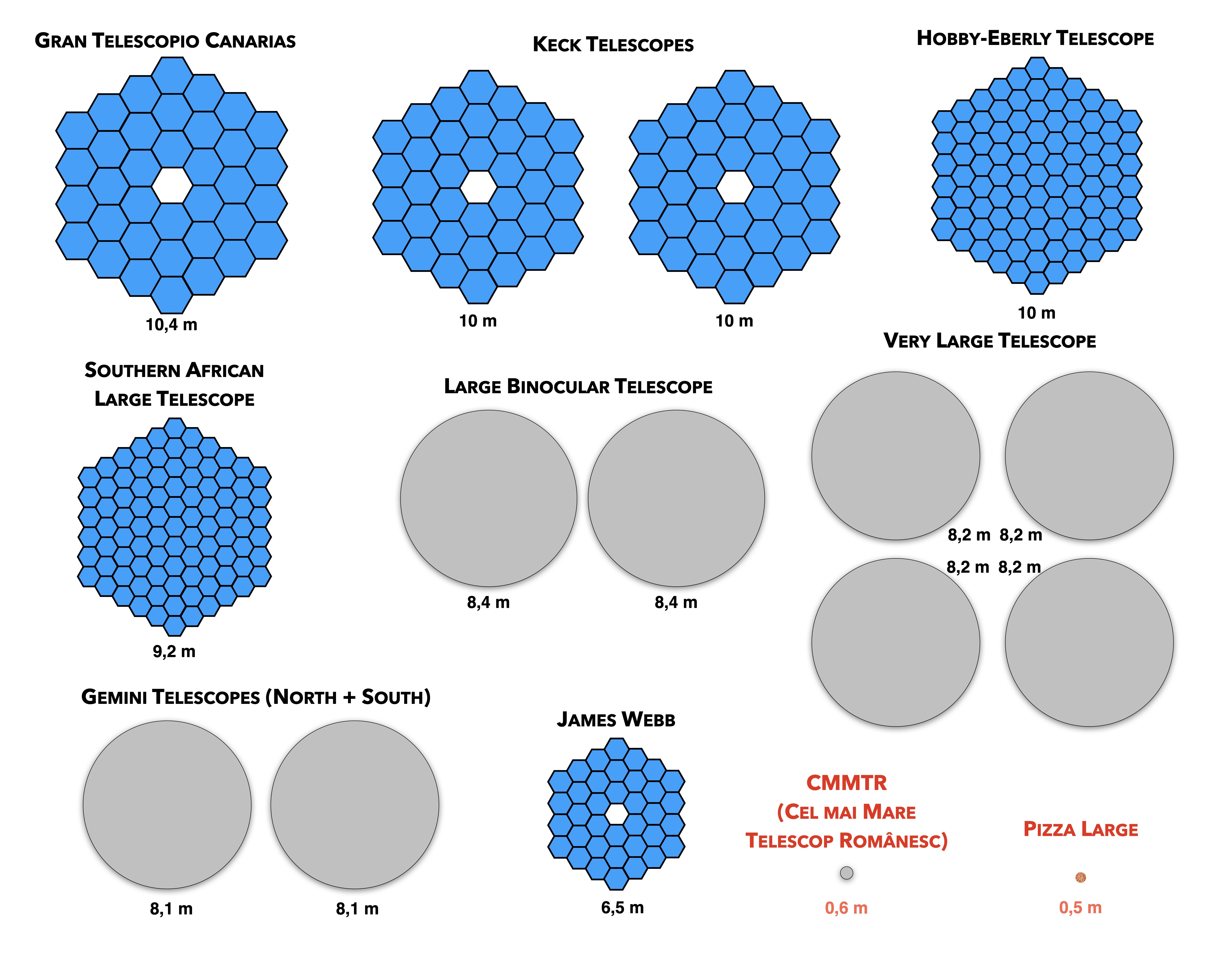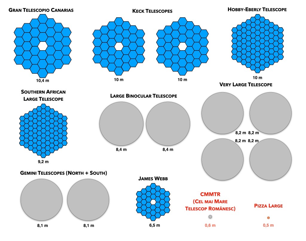 După cum vezi, cel mai mare telescop din România (CMMTR) are o oglindă cât o pizza large de la orice pizzerie și nu uita că vorbesc de telescoapele care aparțin de institute sau universități și care pot fi folosite de cercetători.
