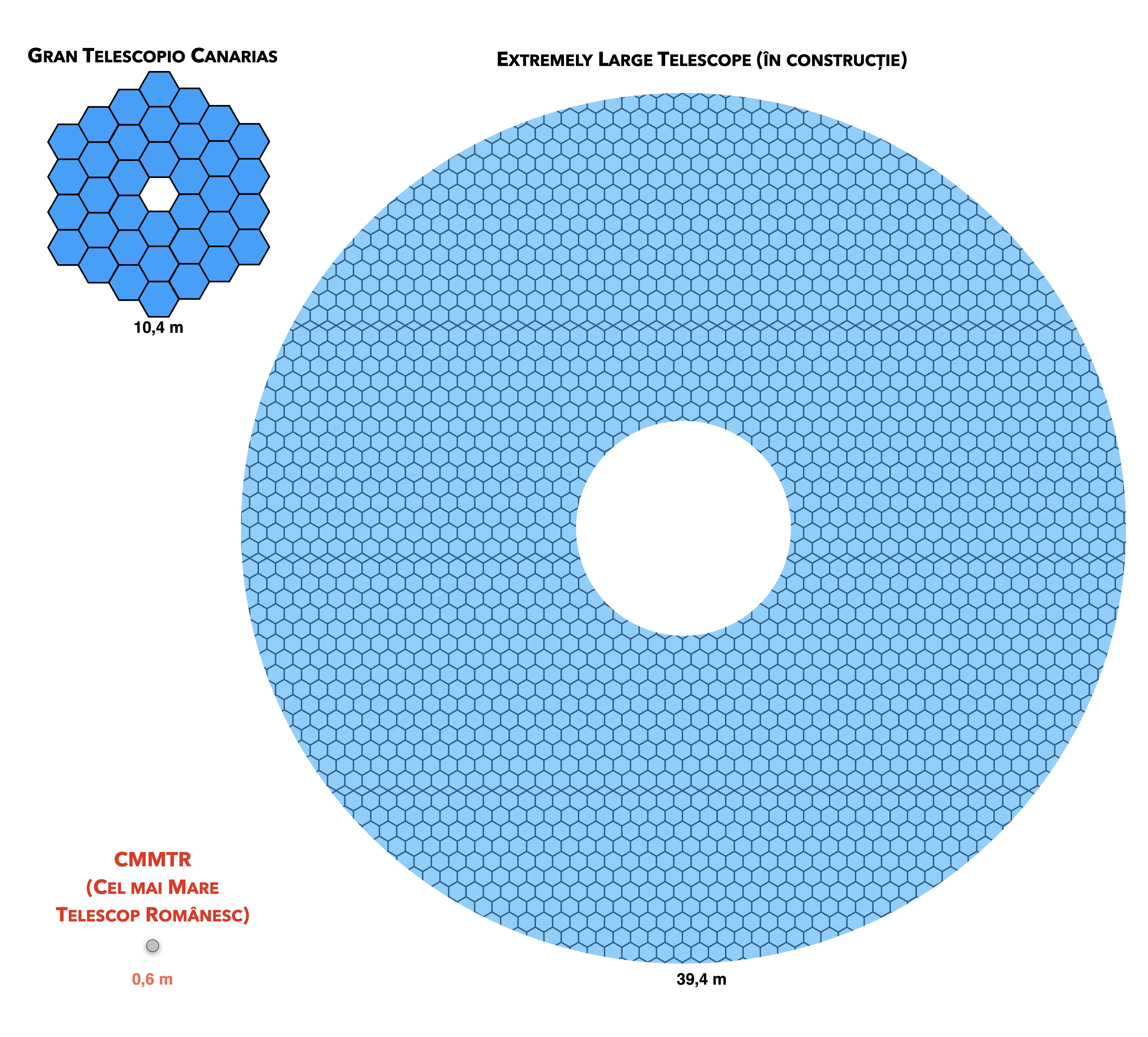 Oglinda va fi compusă din 798 de oglinzi hexagonale, fiecare de 1,4 metri în diametru. Așadar, fiecare oglindă mică este de două ori mai mare decât cel mai mare telescop românesc!