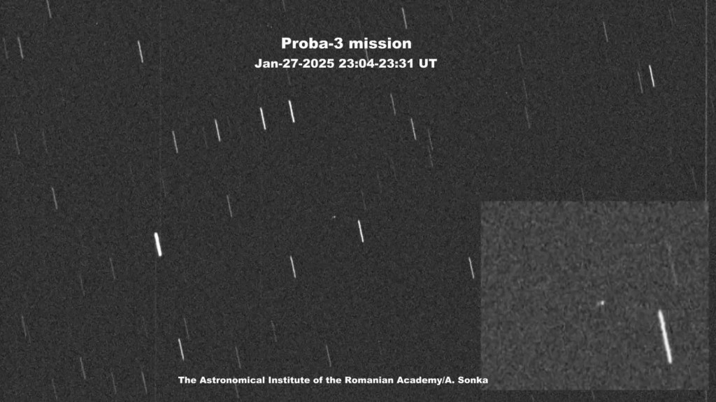 Cele două puncte luminoase care se mișcă printre stele sunt cele două părți ale misiunii ESA Proba-3. Una este un telescop, cealaltă un disc de 1.4 m în diametru care acoperă Soarele și permite telescopului să observe coroana solară. Cele două obiecte se află la 140 m unul de altul.