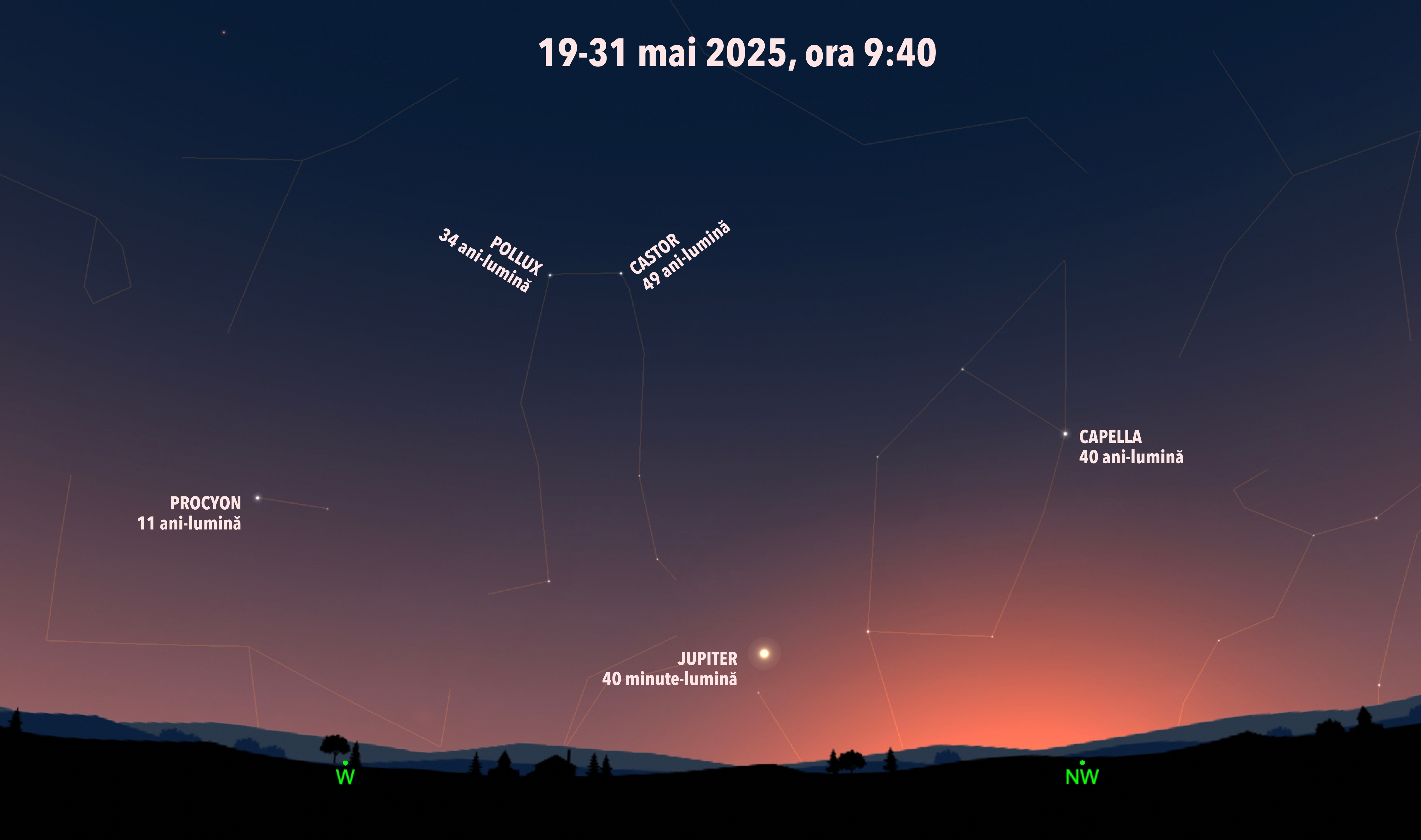 Planeta este Jupiter și se vede începând cu ora 21, spre vest, nu foarte sus față de orizont. Fiind o planetă din sistemul solar, Jupiter este aproape de noi, la distanță pe care lumina o parcurge în 40 de minute. Jupiter se află la 40 de minute-lumină.