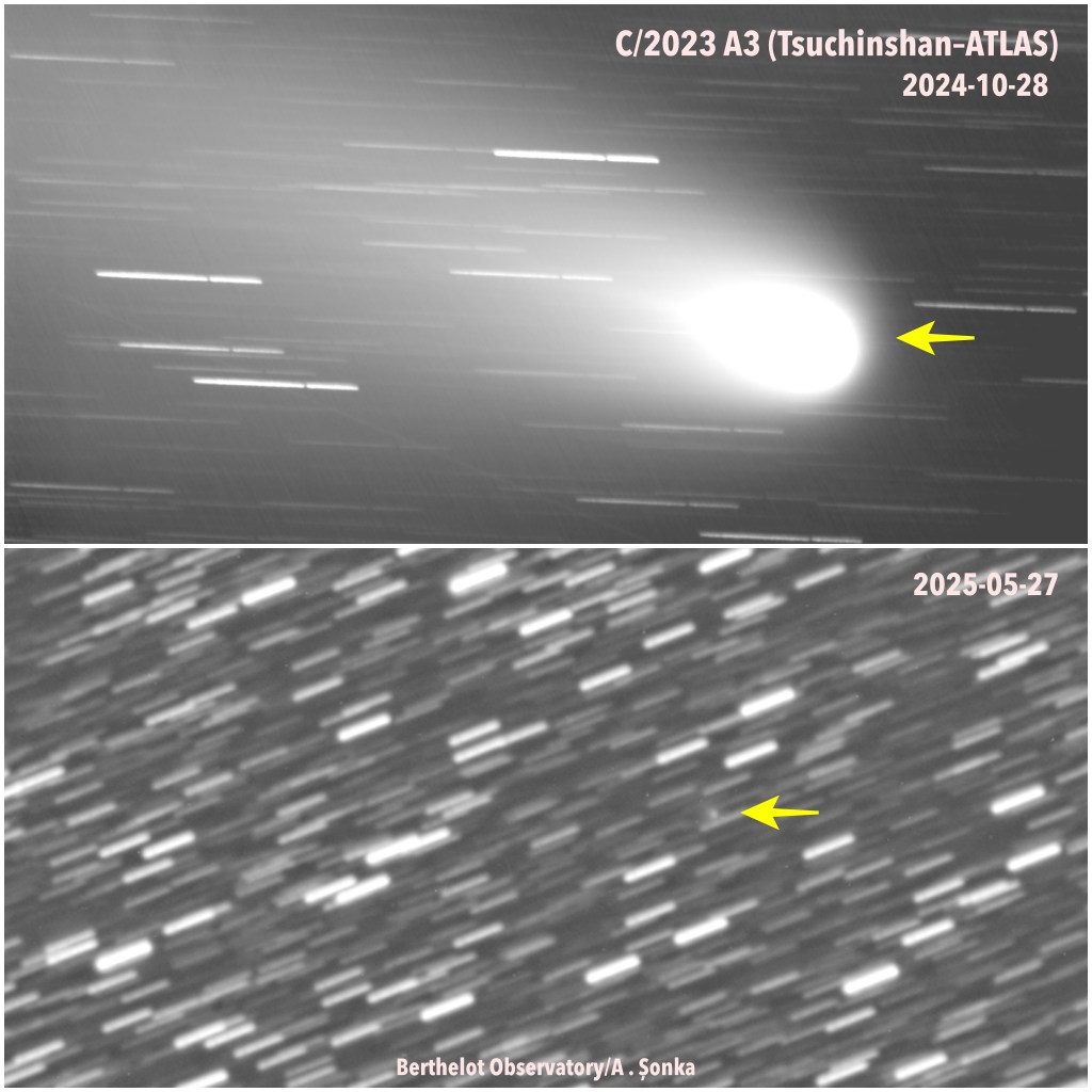 Pe 28 octombrie 2024 (în prima imagine) se afla la 125.000.000 km, iar pe 27 mai 2025 (în a doua imagine) se afla de patru ori mai departe, la 518.000.000.